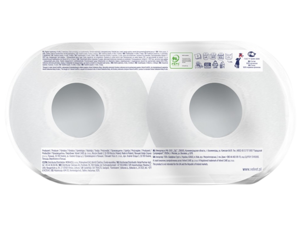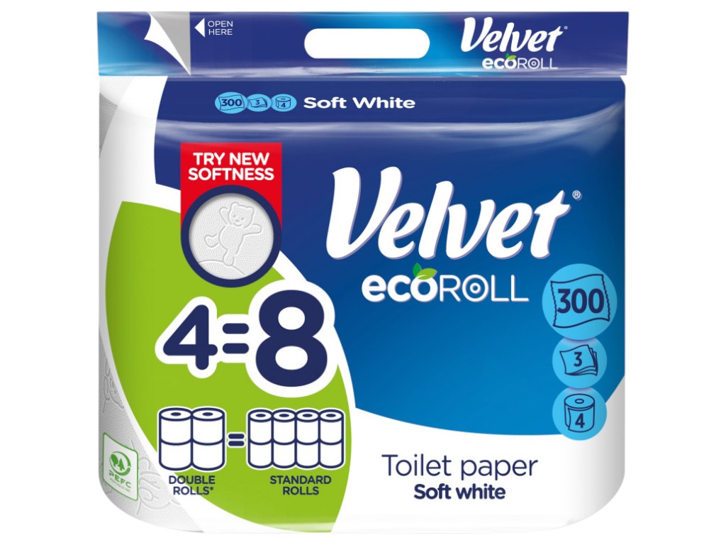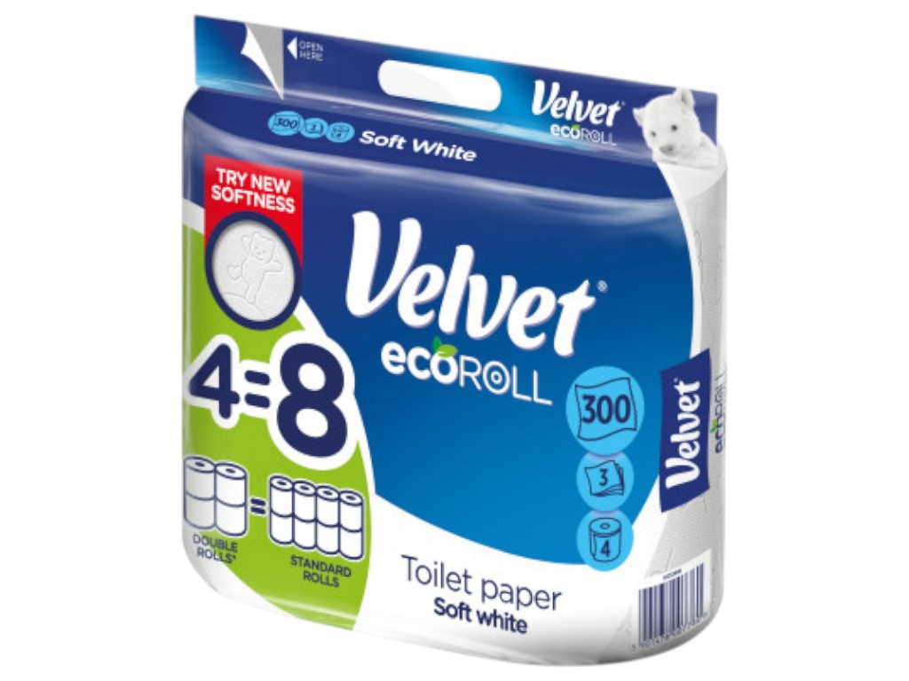 Бумага туалетная Velvet EcoROLL, 3 слоя, 300 листков, 4 рулона, 36х17х14см, цвет белый