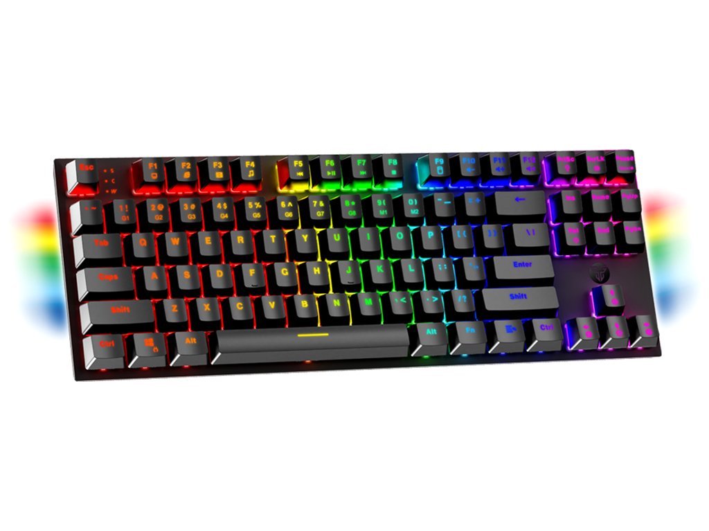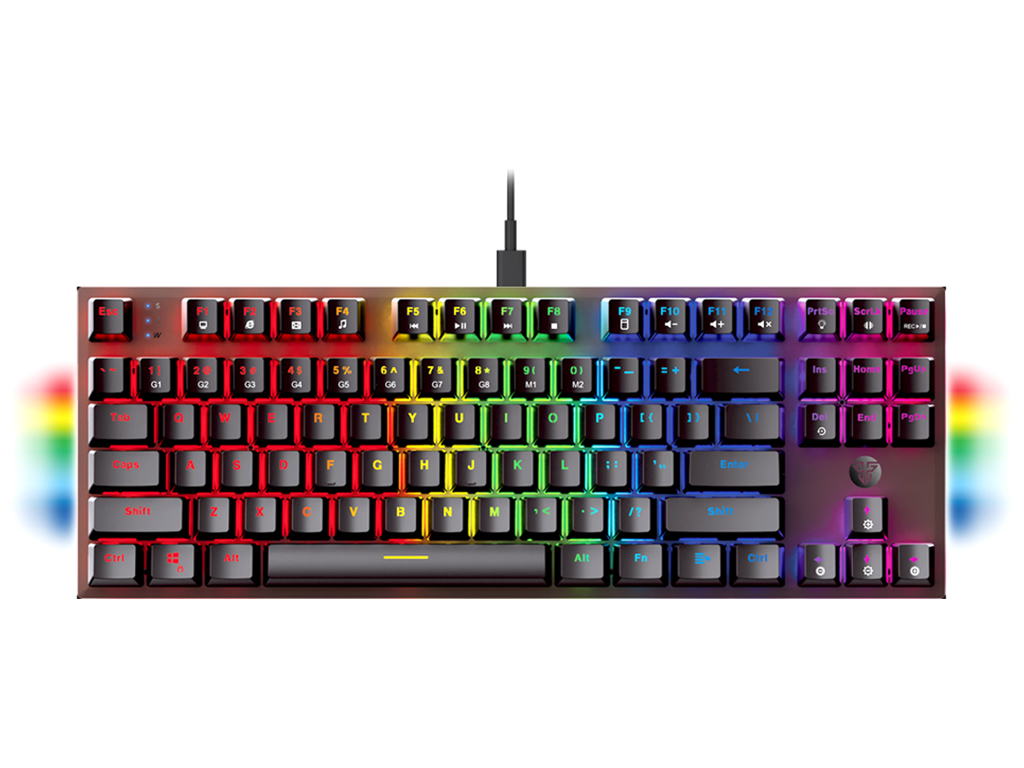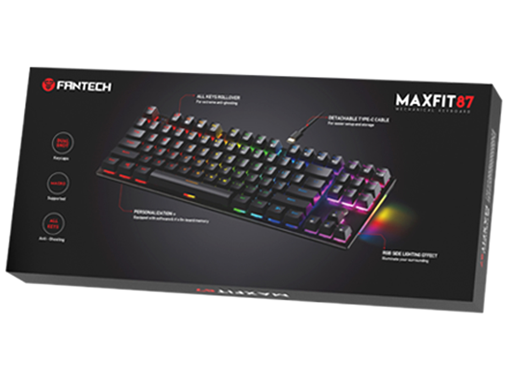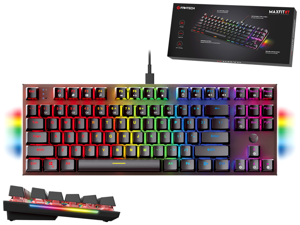 ?Fantech MAXFIT 87 MK856 RGB - это современная механическая клавиатура, которая удовлетворит потребности даже профессиональных киберспортсменов. Данная модель реализована в стильном, практичном дизайне с использованием надежных электронных компонентов и износостойких материалов. Благодаря компактным размерам она не займет много места на столе и освободит пространство для свободного перемещения мышки. Дополнительный комфорт в ее повседневную эксплуатацию внесут складные подставки, которые помогут расположить ее под углом в 1 из 2 положений на горизонтальной поверхности. Корпус устройства качественно собран, изготовлен из прочного ABS пластика.
