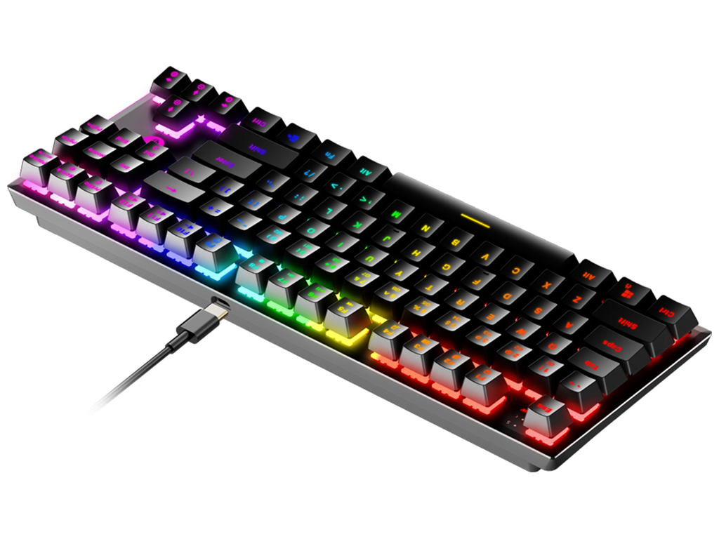 Кейкапы его 87 кнопок выполнены методом двойного литья, что предотвратит стирание их символов. Все клавиши поддерживают технологию “Anti-Ghosting”, поэтому функция фантомного нажатия не сработает при их одновременном нажатии. Кнопки и боковые панели клавиатуры подсвечиваются встроенными RGB светодиодами. Подсветка может работать в 22 режимах (4 режима для боковых панелей) и настраивается с помощью специального ПО. Встроенный разъем Type-C и комплектный кабель помогут легко подключить устройство к компьютеру. Led подсветка: Да; Способ подключения: Проводной; Вес товара без упаковки, кг: 0.794; Высота, мм: 177; Кнопки управления: Механические; Комплектация: Клавиатура, кабель USB - Type-C, мануал, ключ съемник клавиш ; Ширина, мм: 391; Вес товара в упаковке, кг: 1.07; Объем, м3: 0.003806; Глубина, мм: 55; Материал корпуса: Пластик и резина; Цвет: Черный;