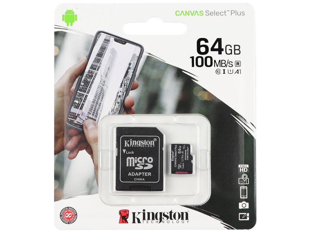 ?Kingston Canvas Select Plus microSDXC (UHS-1) 64gb 10 Class & Adapter - это производительная карта памяти от всемирно известного бренда, которая выделяется скоростной обработкой данных и исключительной надежностью. Она поможет увеличить память на 64Гб совместимых с ней навигаторов и камер, станет отличным дополнением к смартфонам и планшетам под управлением ОС Android. Карта соответствию рейтингу А1, который отображает показатель IOPS (операций ввода/вывода в секунду) при чтении и записи не ниже 1500 и 500 соответственно. Ее интерфейсная шина UHSI категории U1 гарантирует минимальную скорость записи данных на уровне 10МБ/с, при этом скорость чтения может достигать 100МБ/с. Класс видео V10 позволяет без задержек записывать видео в формате Full HD прямо на карту с минимальной гарантированной скоростью 10МБ/с. Аксессуар изготовлен с использованием электронных компонентов и качественных материалов, прошел испытания в самых экстремальных условиях, которые подтвердили высочайший уровень защиты помещённых на него данных. Карта памяти комплектуется переходником-адаптером с MicroSD на SD.