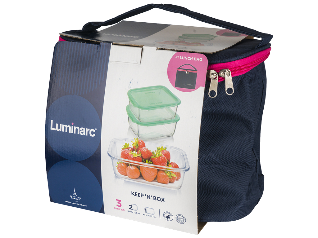 Набор контейнеров пищевых Luminarc Keep'n Box + термосумка. Размер с крышкой: 2шт 13х13х5,5см (380мл), 19х14х6,2см (820мл). Размер термосумки: 25х17х21см. Особенности: французское качество материалов, дизайнов и декоров; устойчивость к повреждениям при ежедневном использовании; изготовлено из закаленного стекла – самого гигиеничного материала (крышка из пластика). Можно использовать посуду в микроволновой печи и в посудомоечной машине. Плотное закрывание крышки.