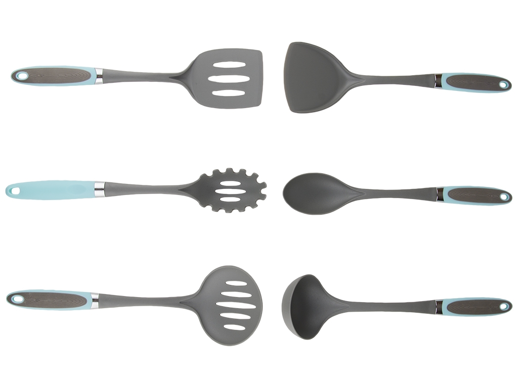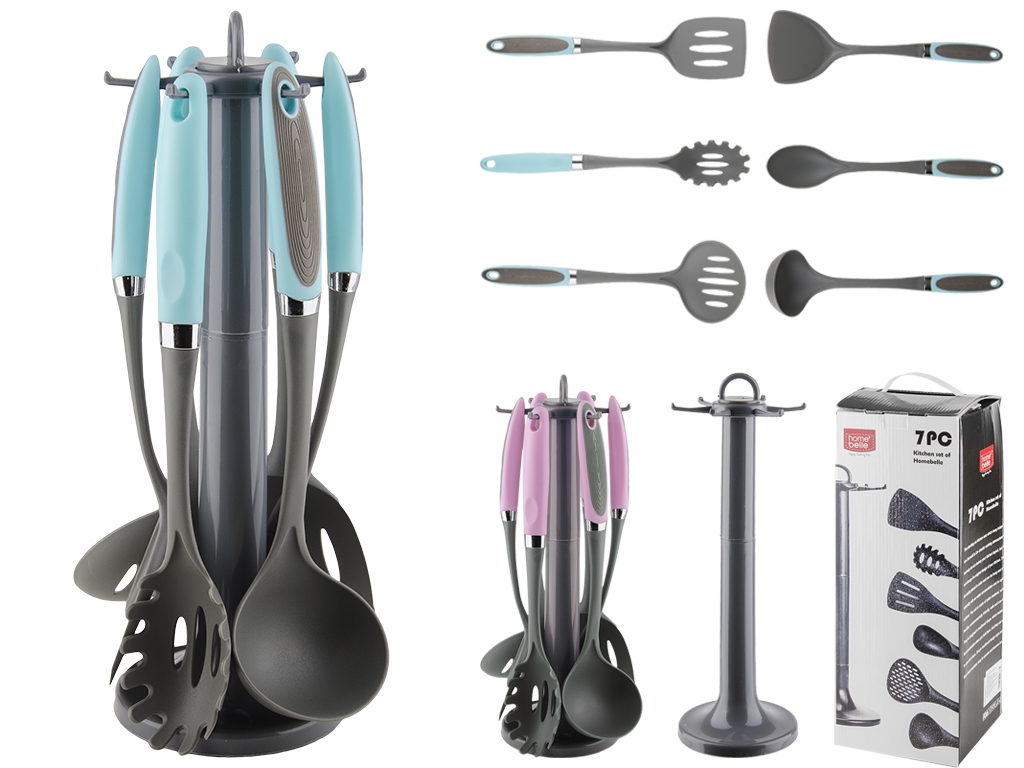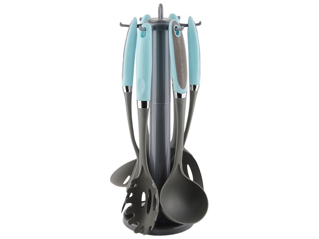 Материал: пластик. Упаковка: цветная коробка. Количество предметов 7, включая подставку: половник, лопатка кухонная 34,3х9,8х4,5см, лопатка кухонная с перфорацией 34,2х8,3х4,5см, ложка для спагетти 35,2х6,2х3,8см (глубина 3,3см), ложка для соуса 34,2х6х2,5см (глубина 2,1см), шумовка 10,8х34,8х7,9см (глубина 2,2см), подставка 12,9х12,9х38,1см. Основу с крючками можно вращать, что облегчает поиск кухонного инструмента. Ручки голубого или розового цвета, основной цвет серый (21х2,8х2см). Подставка устанавливается на стол, оборудована петлей для переноски и 6 крючками. На подставку предметы вешаются отверстием в ручке.