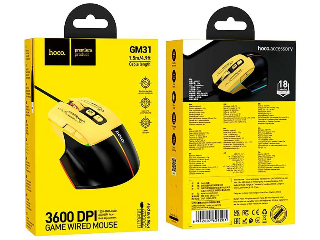 Игровая мышь Hoco GM31 Overlord luminous обеспечивает максимальный комфорт и точность в самых динамичных играх. Уникальный двухцветный дизайн с яркими кнопками и динамичной RGB LED подсветкой изогнутых и прямых линий корпуса. Идеально сбалансированный вес (110г) и оптимальные размеры (121×83×45мм). Эргономичная форма с расширением у основания для максимально удобного хвата правой рукой с удобным расположением пальцев. 4 накладки (глайды) из износостойкого полимерного материала на нижней панели. Внешняя оплетка встроенного кабеля из качественного нейлона с приятной на ощупь плетеной структурой. 7 кнопок: функциональное колесо прокрутки, 2 стандартные и 2 дополнительные кнопки, а также 2 кнопки для смены DPI. Надежные переключатели кнопок с быстрым откликом и ресурсом в 3млн нажатий. Производительный основной чип A603EP оптического сенсора, который может работать в 4 режимах с разрешением 1200, 1800, 2400 и 3600DPI. Поддержка технологии Plug and Play и совместимость с большинством ОС.