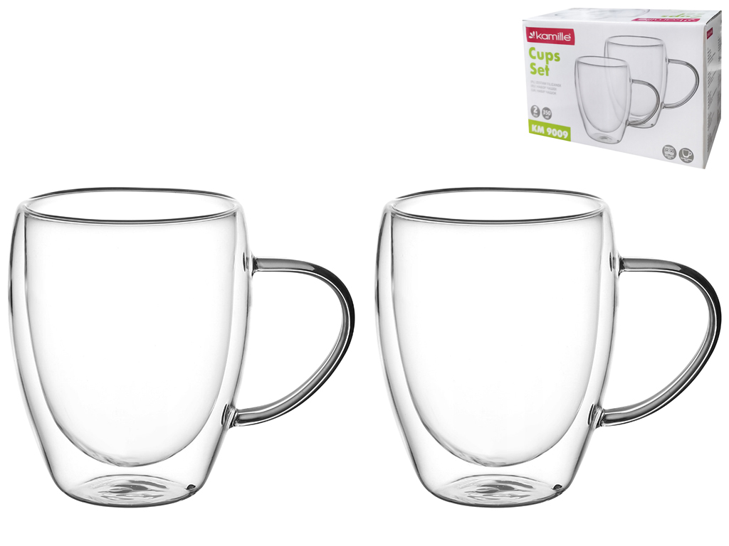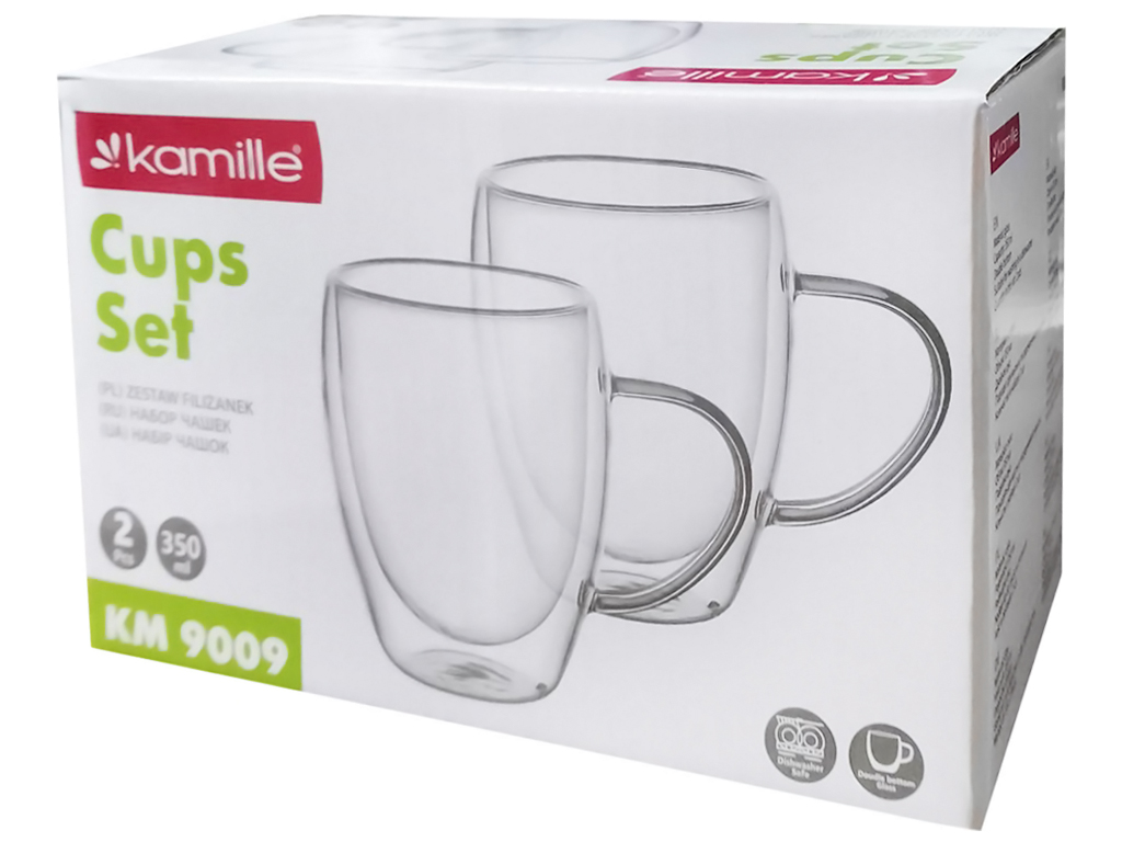 Набор чашек 350мл. Изготовлены из высококачественного боросиликатного стекла, что гарантирует экологичность и безопасность для вашего здоровья. Стекла с двойными стенками чрезвычайно легкие, и в то же время гораздо прочнее и устойчивее к царапинам и повреждениям, чем стекла, изготовленные из традиционного стекла. Вакуум между стенами гарантирует высокие теплоизоляционные свойства. Стаканы легко содержать в чистоте, их можно мыть в посудомоечной машине. Стаканы с двойными стенками идеально подходят для подачи капучино, чая, кофе латте или других горячих и холодных напитков.