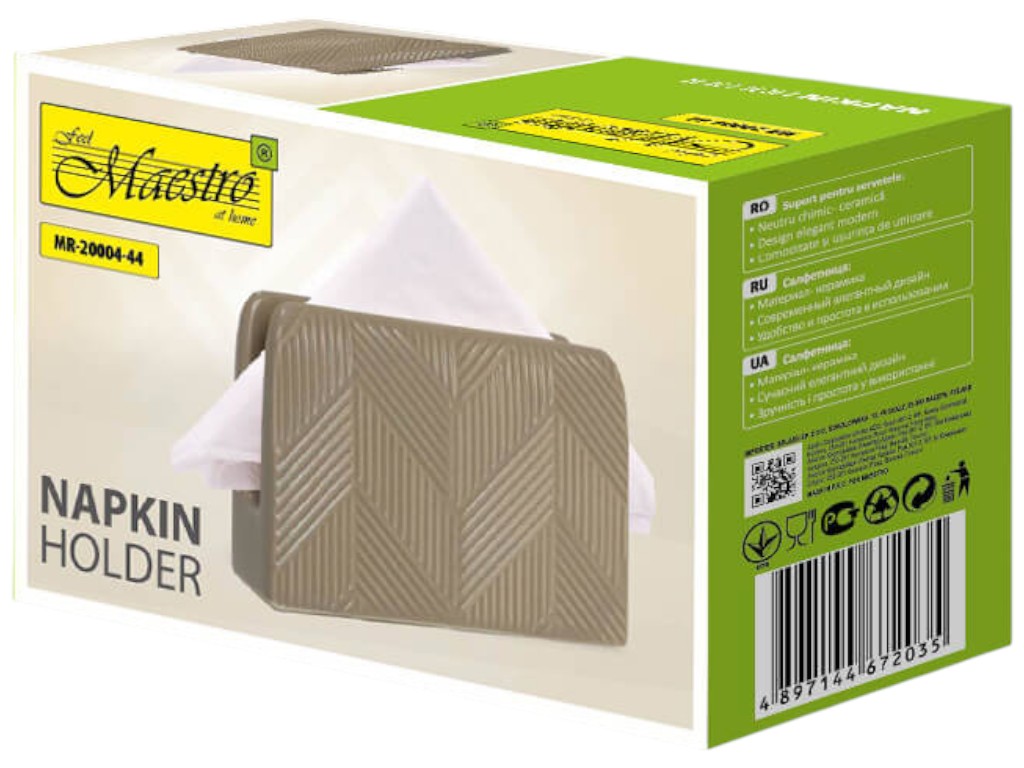 Салфетница Maestro Geometry Beige станет аккуратным и выразительным элементом сервировки, который объединяет эстетику и удобство. Ее форма лаконична и устойчива, а поверхность украшена рельефным геометрическим узором, создающим мягкий светотеневой эффект. Бежевый оттенок делает аксессуар универсальным — он легко сочетается с различной посудой и текстилем, добавляя интерьеру завершенности. Керамическая основа устойчива к износу, не теряет цвета со временем и проста в уходе. Она подходит как для повседневного использования, так и для праздничной сервировки. Для очистки достаточно протереть поверхность мягкой губкой без применения абразивов. Изделие упаковано в фирменную коробку Maestro, что делает его удобным для хранения или подарка.