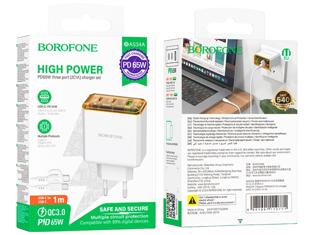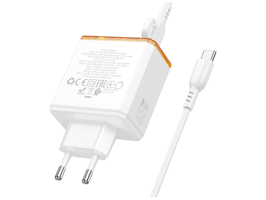 Сетевое зарядное устройство Borofone BAS34A оснащено тремя выходами: двумя разъёмами Type-C и одним USB, с поддержкой протоколов быстрой зарядки PD65W, QC3.0, AFC и FCP. Обеспечивает мощность до 65Вт через порт Type-C1 и позволяет одновременно заряжать несколько устройств с оптимальным распределением тока. Устройство выполнено в монолитном корпусе из ABS-пластика и комплектуется кабелем Type-C to Type-C длиной 1м. Размеры 130×85×35мм делают адаптер компактным для переноски. Работает в диапазоне напряжений 110–240V и подходит для большинства смартфонов, планшетов и ноутбуков.