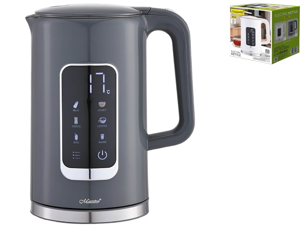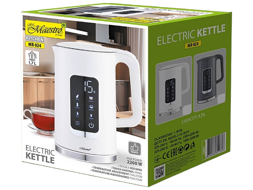 Чайник электрический Maestro, с сенсорной панелью управления. Объем: 1,7л. Мощность: 220-240В, ~50Гц, 1850-2200Вт. Новый современный дизайн и двойной корпус. Индикатор уровня воды. Функция регулировки и поддержания температуры.