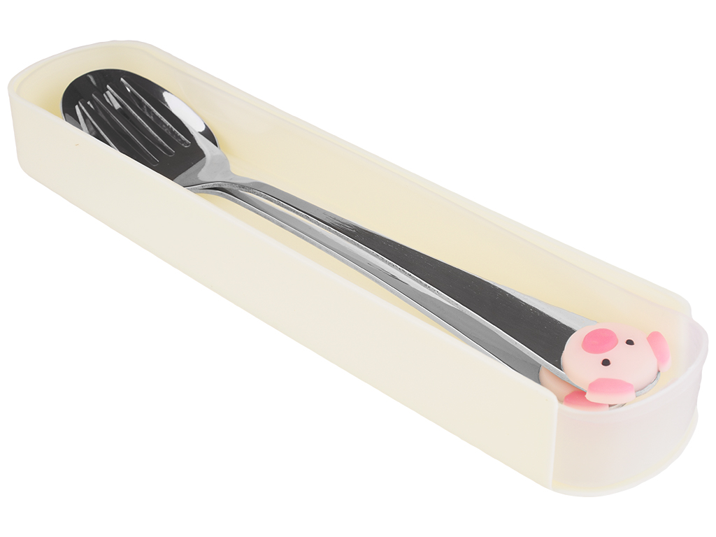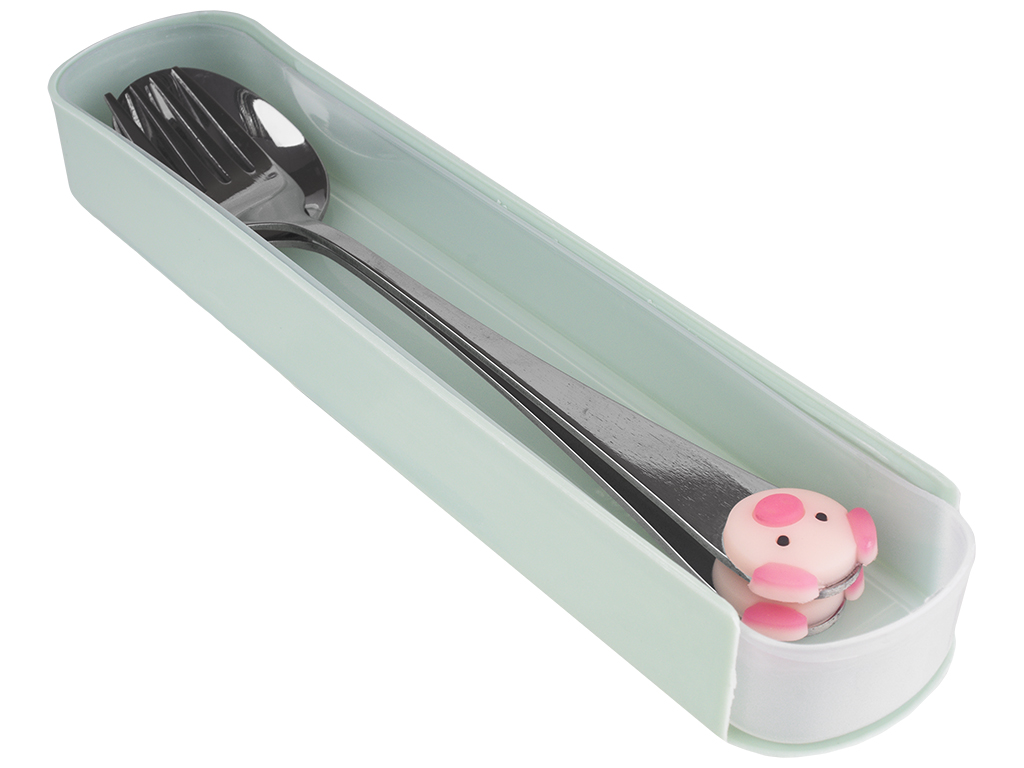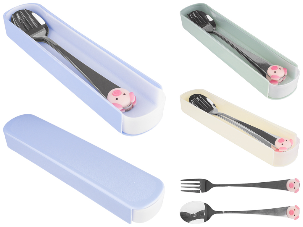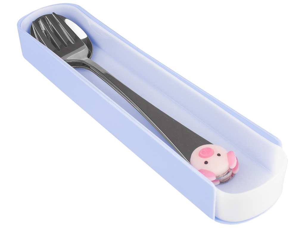 Размер пластикового чехла-пенала: 19,9х4,4х2,5см. Размеры столовых приборов: ложка - 17,1х3,2см, вилка - 17х2см. Материал приборов: металл, ПВХ (декор "свинка"). Материал футляра: нижней части - полипропилен, верх пластмасса. Цвета футляров: кремовый, голубой, серый ментоловый. Цвет декора на приборах в розовых тонах. В мягкой упаковке.