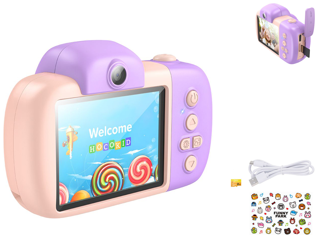 Детская камера Hoco DV201 станет отличным выбором для знакомства ребенка с современной техникой и, возможно, совершения первых шагов в мир профессиональной фото- и видеосъемки. Крепление для ремешка и эргономичная форма с объемными деталями для максимально удобного хвата двумя руками. Приятная на ощупь матовая поверхность, которая предотвращает скольжение пальцев. Небольшой вес (всего 47г) и компактные размеры (95.4×65.5×47.2мм). Корпус из ударостойкого пластика и надежные электронные компоненты. Качественный IPS дисплей диагональю 2.4 дюйма с разрешением 240×320 пикселей. Удобно расположенные кнопки управления и крупная кнопка спуска затвора. Современная основная камера с CмOS-сенсором GC2155 с разрешением 2мP и процессором изображения Lingtong GP6624. Съемка фото с разрешением 32мP и видео в формате FHD (1920×1080 пикселей). Яркая вспышка и дополнительная камера для съемки селфи. Встроенный аккумулятор емкостью 600мAh (3.7V).