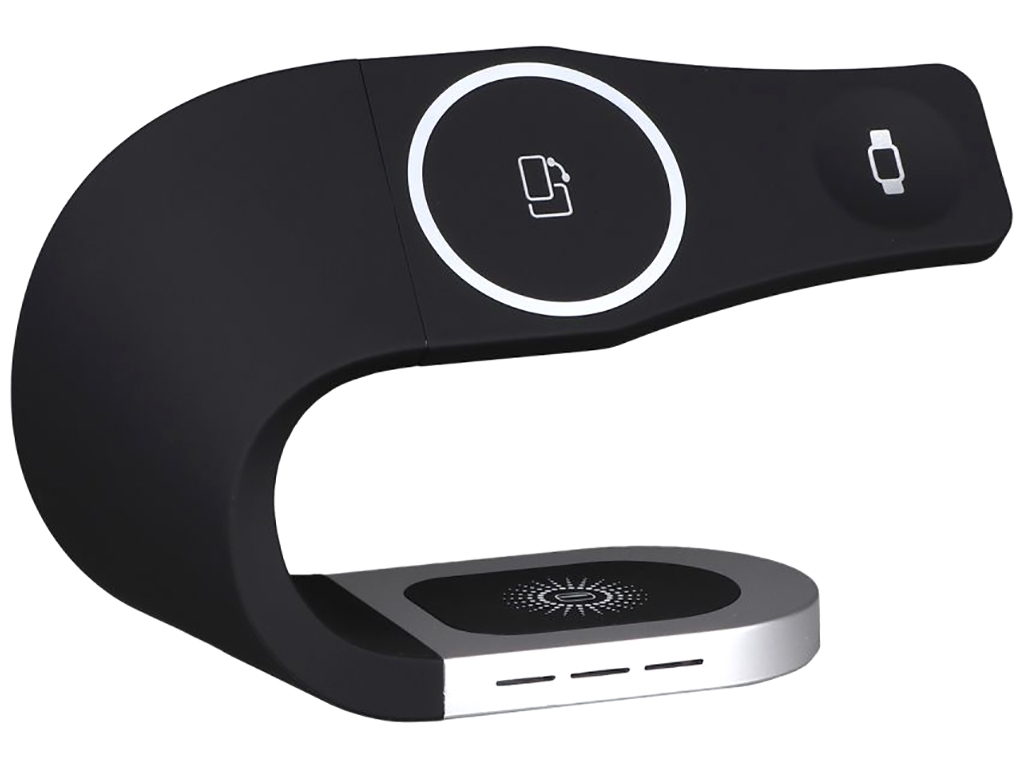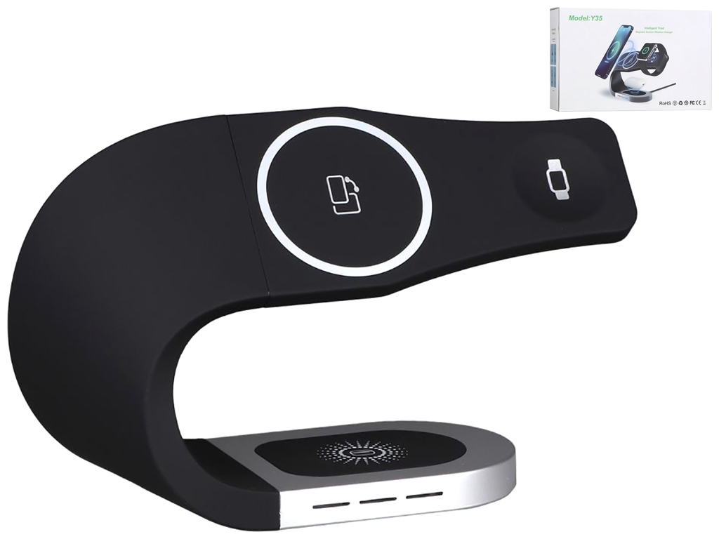 ?Беспроводное зарядное устройство с MagSafe Y35 3in1 - это мультифункциональная док-станция, разработанная для максимально комфортной зарядки портативных гаджетов, поддерживающих технологию Qi: смартфонов, смарт часов, TWS наушников. Модель реализована в практичном, элегантном дизайне и имеет достаточно компактные размеры, поэтому лаконично впишется в любой современный интерьер и не займет много места, располагаясь, например, на прикроватной тумбочке в спальне, журнальном столике в гостиной или рабочем столе. Корпус устройства надежно собран, изготовлен из прочной комбинации ABS пластика, алюминиевого сплава, акрила и поликарбоната. Его продуманная конструкция и изогнутая форма позволяет одновременно заряжать гаджеты на 3 площадках для беспроводной зарядки. Устойчивое основание аксессуара оснащено светодиодной полосой для контроля за его работой, разъемом Type-C (female) для подключения сетевого кабеля, USB с силой тока на выходе 2A для проводной зарядки и площадкой для беспроводной зарядки кейса TWS гарнитуры. На изогнутой части находятся площадки для зарядки часов и смартфона, который может устанавливаться горизонтально или вертикально и крепится с помощью встроенных магнитов. Магнитное крепление совместимо с технологией MagSafe на iPhone и другими смартфонами, на которые необходимо предварительно зафиксировать входящее в комплект кольцо. Общая максимальная мощность на выходе беспроводной зарядки может достигать 15W и автоматически регулируется в зависимости от характеристик гаджета. Источником питания для аксессуара может служить повербанк или сетевой адаптер, который поддерживает быструю зарядку с силой тока и напряжением на выходе 2A и 9V соответственно.