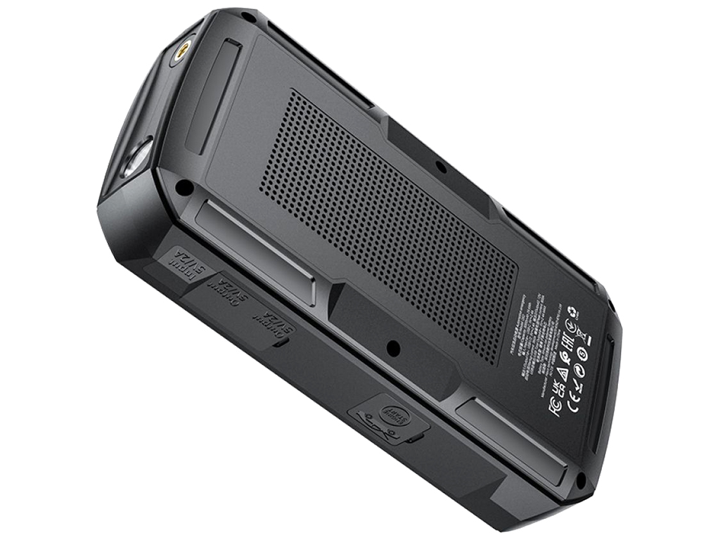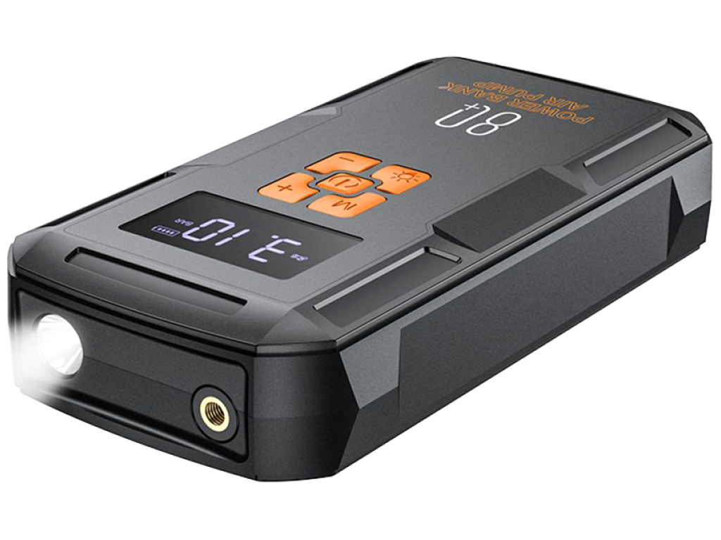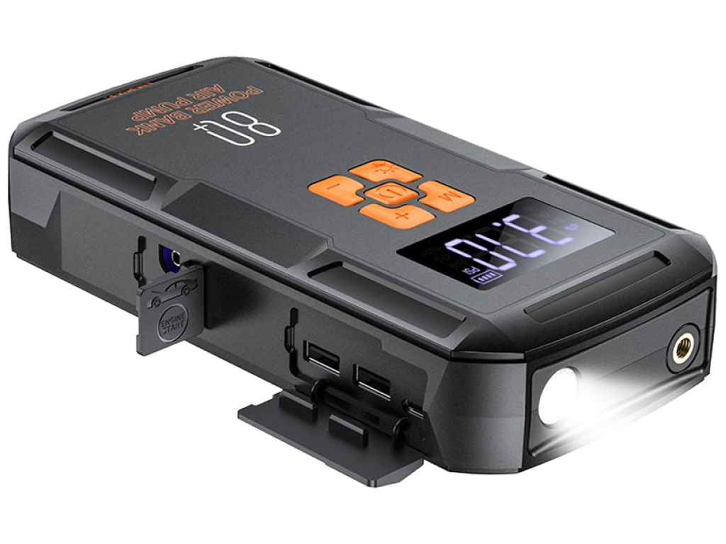 Емкость его энергоэффективной литий-полимерной батареи составляет 8000mAh (29.6Wh). Уровень ее заряда отображается на дисплее, а быстрый процесс ее зарядки обеспечивается через разъем Type-C с силой тока 2.4A при напряжении 5V. Разъемы USB предназначены для зарядки портативных гаджетов. Сила тока на выходе каждого из них может достигать 2.4A при напряжении 5V. Общая максимальная мощность на их выходе составляет 12W (5V/2.4A). Компрессор обеспечивает подачу воздуха с давлением 0-10.3 бар (0-150PSI), имеет 4 предустановленных режима: автомобильная шина, мотоциклетная шина, велосипедная шина, баскетбольный мяч. На дисплее отображается выбранный режим его работы и 4 значения давления (PSI, BAR, KPA, Kg/см²). Фонарь может работать с периодическим миганием, в обычном режиме и режиме SOS. Максимальная сила пускового тока джамп стартера составляет 800A, а напряжение равно 12V. Он поможет запустить автомобиль с севшим аккумулятором даже в морозную погоду, совместим с бензиновыми двигателями объемом до 4.0л и дизельными двигателями объемом до 2.0л. Устройство комплектуется силовым кабелем с зажимами типа крокодил, трубкой с насадкой для компрессора и 4 переходниками для него, инструкцией и кабелем Type-C для зарядки. Тип зарядки: Проводной;