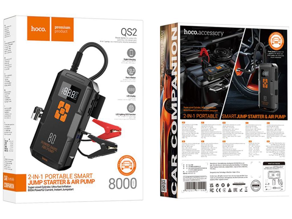 Универсальная мобильная батарея Hoco QS2 – это мультифункциональное устройство, которое должно быть в арсенале каждого владельца автомобиля. Оно лаконично объединяет в себе функции классического повербанка, фонаря, джамп стартера и компрессора. Модель привлекает внимание оригинальным дизайном с яркими, контрастными деталями, выделяется простотой в эксплуатации и исключительной надежностью. Благодаря компактным размерам, она не займет много места в рюкзаке или в бардачке автомобиля. Детали ее ударостойкого корпуса качественно собраны, изготовлены из прочной комбинации огнестойкого поликарбоната и ABS пластика. На его верхней панели находятся кнопки управления и информативный LED дисплей, в одном из торцов – выход компрессора и фонарь, а на боковой грани – 2 разъема USB, разъем Type-C и интерфейс EC5 для подключения силового кабеля джамп стартера.