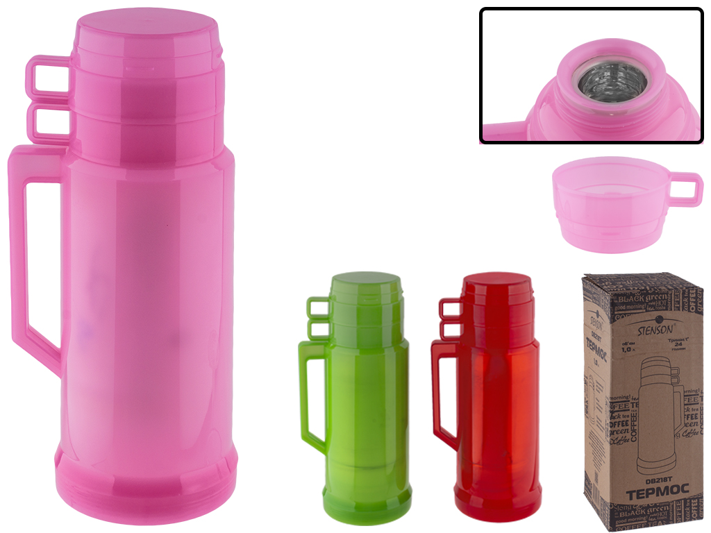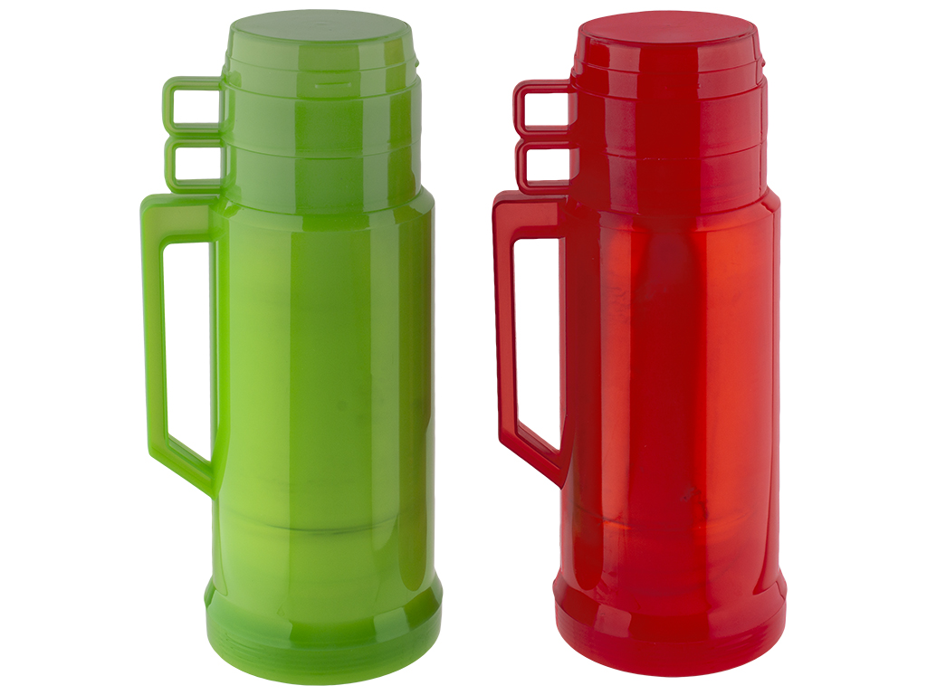 Объем: 1000мл. Колба: стекло. Корпус: пластик. Винтовая герметичная пробка. Две крышки-чашки с ручкой, закручивается на резьбу. Термос оборудован ручкой. Цвета ассорти.