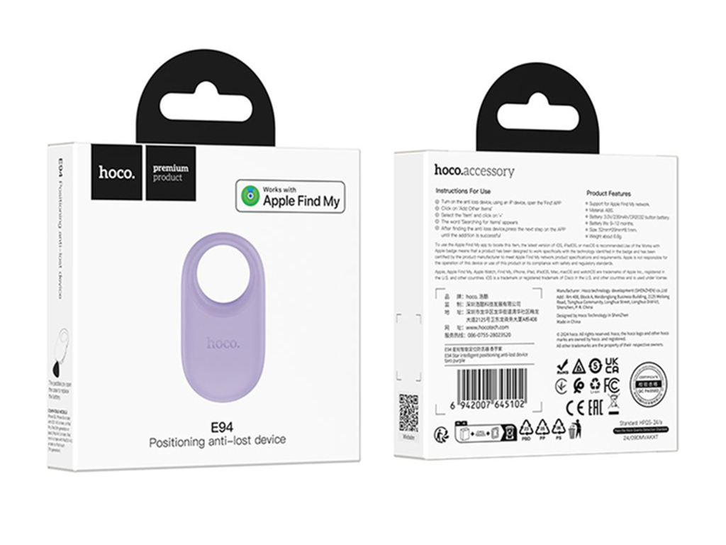 Устройство предназначено для быстрого поиска и отслеживания важных предметов с помощью современных технологий позиционирования и звукового сигнала. Корпус выполнен из прочного ABS пластика с компактной монолитной конструкцией и удобным держателем для крепления на ключах, сумке или рюкзаке. Умный брелок поддерживает работу в системе Apple Find My, обеспечивая точное позиционирование через GPS и передачу данных по Bluetooth. Питание осуществляется от встроенной батареи с длительным сроком службы. Бренд Hoco реализует функциональный аксессуар для упрощения повседневного использования.