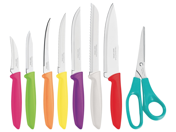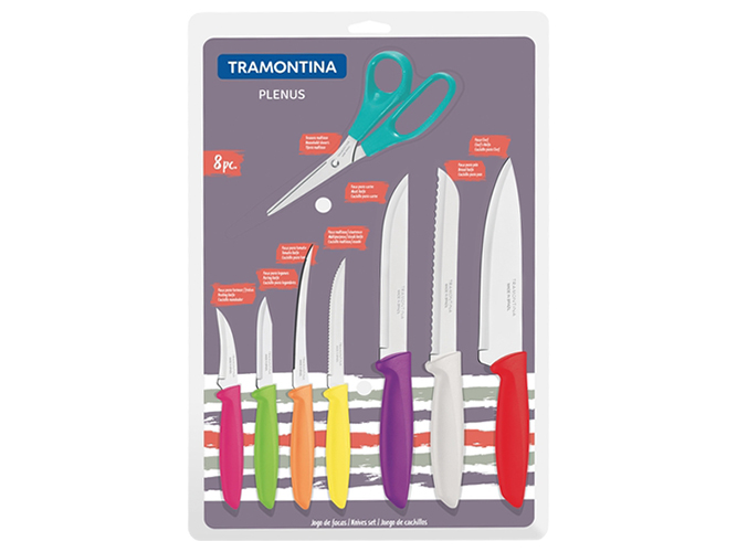 Набор ножей Tramontina Plenus, 8 предметов. Комплектация: нож поварской Шеф 1шт-18см (красный), нож для хлеба 1шт-18см (белый), нож для мяса 1шт-15,2см (фиолетовый), нож для стейка 1шт-12,7см (желтый), нож для томатов 1шт-10,2см (оранжевый), нож для овощей 1шт-7,6см (салатовый), нож разделочный 1шт-7,6см (розовый), ножницы 1шт-20,3см (бирюзовые). Материал лезвия: нержавеющая сталь AISI 420. Материал рукоятки: полипропилен. Режущая кромка ножа: гладкая\зубчатая. Упаковка: индивидуальный блистер. Количество в наборе: 8шт.
