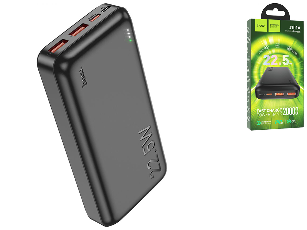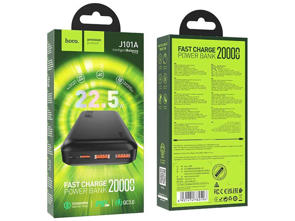 ?Power Bank Hoco J101A Astute - это портативный источник питания, который поможет легко и быстро зарядить смартфон или другой гаджет несколько раз в любых условиях. Данное устройство выделяется поддержкой одновременной зарядки 3 гаджетов и наиболее распространенных протоколов быстрой зарядки с максимальной мощностью 22.5W. Благодаря компактным размерам и достаточно небольшому весу его с комфортом можно брать с собой, например, в длительные поездки, на прогулки или отдых на природе. Корпус повербанка выполнен в практичной форме со скругленными ребрами и приятной на ощупь поверхностью, изготовлен из надёжной комбинации прочного ABS пластика и огнестойкого поликарбоната. Его встроенная литий-полимерная батарея имеет емкость 20000mAh, отличается длительным сроком службы и низким уровнем саморазряда. Определить уровень ее заряда помогут LED индикаторы и механическая кнопка для их активации. Все разъемы устройства находятся в одном из его торцов и представлены следующими интерфейсами: разъем Micro-USB для его зарядки; пара USB портов для зарядки сторонних гаджетов; разъем Type-C, способный поставлять питание в обе стороны. Разъем Micro-USB поддерживает технологии QC, FCP и AFC с максимальной мощностью на входе 18W, а разъем Type-C - PD, QC, FCP и AFC с максимальной мощностью на входе 18W и 20W на выходе. Каждый из USB портов поддерживает быструю зарядку по протоколам QC, SCP, FCP и AFC. Мощность на их выходе может достигать 22.5W. Общая сила тока на выходе разъемов ограничена 3A при напряжении 5V.