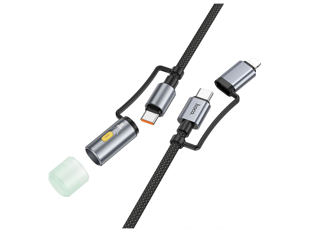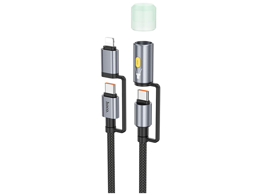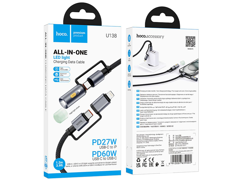 Кабель USB Hoco U138 USB-C/iP to USB-C/LED Light выделяется конструкцией с переходником и насадкой для обеспечения дополнительного функционала и совместимости с огромным количеством современных устройств. Повышенная устойчивость к разрыву, растяжению, спутыванию, воздействию высоких и низких температур. Качественные коннекторы с надежными контактами и никелированным покрытием металлических деталей. Практичная форма корпусов разъемов из алюминиевого сплава с пластиковой защитой от изломов в местах соединения с кабелем. Съемная насадка - достаточно яркий LED фонарик с кнопкой для включения и дополнительным колпачком для создания рассеянного и мягкого освещения. Надежные фиксаторы переходника и насадки-фонаря, предотвращающие их потерю. Качественное экранирование и пятижильный сердечник из 178 медных проводников (2*(65/0.08) + 3*(16/0.08), OD5.0мм). Тип коннекторов: Type-C/Lightning - Type-C/LED фонарик. Поддержка передачи данных и быстрой зарядки с мощностью до 27W для Type-C - Lightning и до 60W (20V/3A) для Type-C - Type-C.