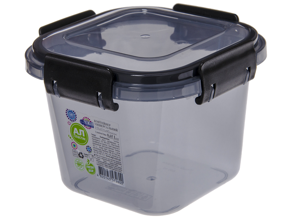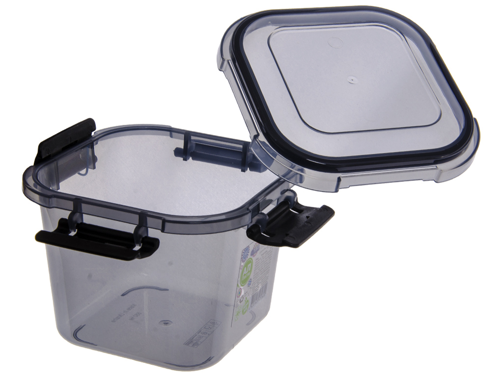 Размер контейнера: 12,1х12,1х9,2см. Объем: 650мл. Материал: полипропилен. Крышка закрывается на замки защелки с 4 сторон. Для плотного закрытия крышка оснащена силиконовым уплотнителем. Контейнер прозрачный слегка окрашен пищевым красителем темного цвета. Контейнер предназначен для пищевых продуктов и организации хранения. Без упаковки.