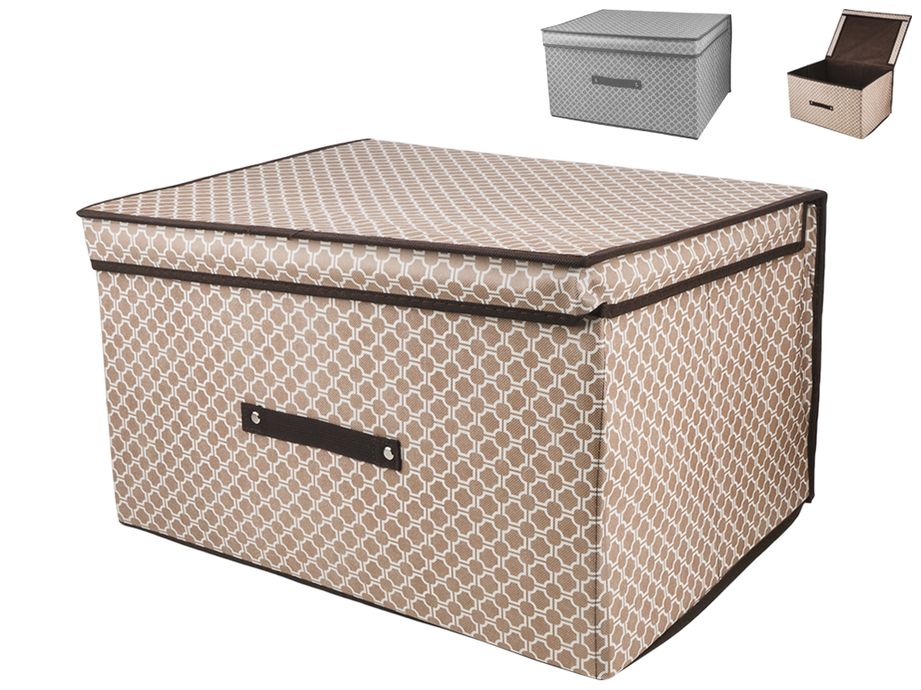 Размер: 35х30х20см. Материал: нетканое полотно с принтом под мешковину, картон. Цвета ассорти. Коробка-органайзер ПВХ для хранения белья. Крышка откидная не снимается, закрывается на одну липучку. На тыльной стороне расположена ручка. Поставляется в пакете.