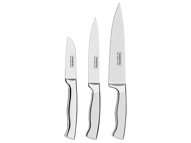Набор ножей Tramontina Cronos в комплекте: для овощей-7,6см, универсальный-12,7см, шеф-20,3см. Материал лезвия: нержавеющая сталь. Материал рукоятки: нержавеющая сталь. Количество предметов: 3 предмета.