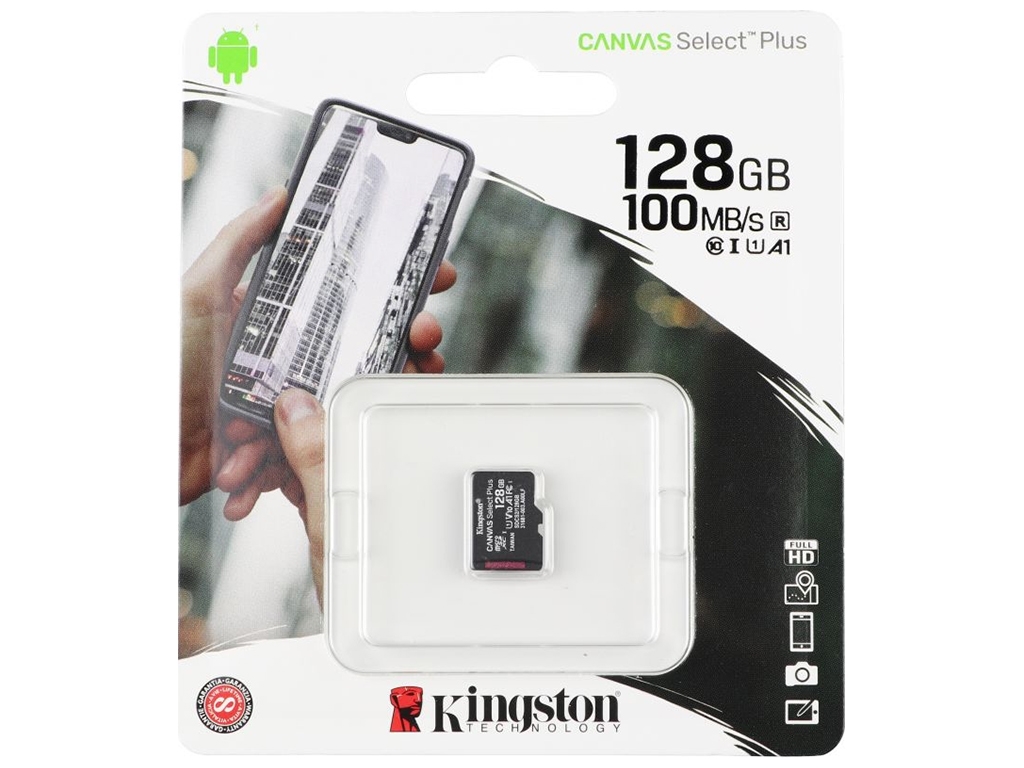 ?Kingston Canvas Select Plus microSDXC (UHS-1) 128gb 10 Class станет идеальным выбором для полноценного расширения памяти современных смартфонов, планшетов, камер, навигаторов и других совместимых устройств. Модель выделяется высокой производительностью и исключительной надежностью. Для ее изготовления используются прочные материалы и качественные электронные компоненты, что в сочетании с защитой от ударов, электромагнитного излучения, воздействия воды и высоких температур гарантирует длительный срок службы и сохранность данных даже в самых экстремальных условиях. Благодаря соответствию классу производительности А1, данная карта памяти объемом 128Гб способна обеспечить быструю загрузку приложений при использовании в Android устройствах, выполняя во время чтения и записи не менее 1500 и 500 операций ввода и вывода в секунду соответственно. За счет интерфейсной шины UHSI категории U1 гарантируется скорость записи данных на уровне не менее 10Мб/с, а скорость из чтения может достигать 100Мб/с. Беспроблемное считывание видео в формате Full HD и запись c минимальной скоростью 10МБ/с подтверждается классом видео V10.