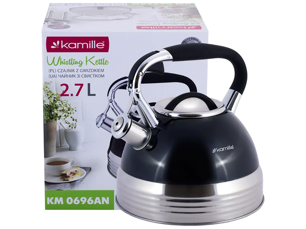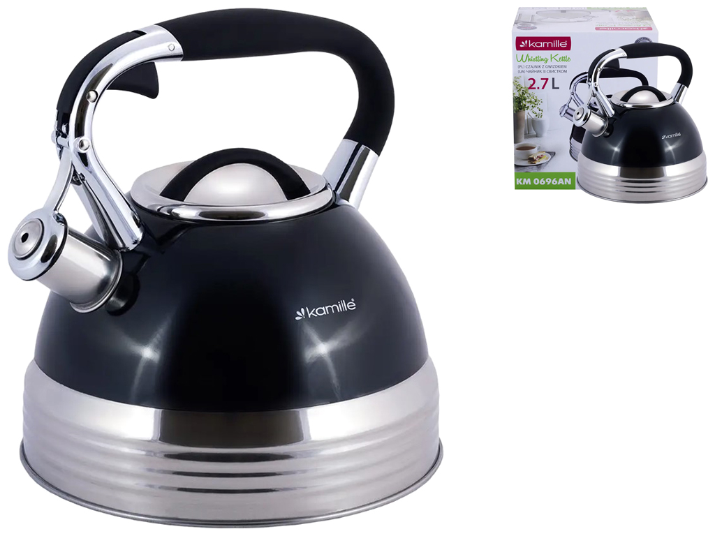 Чайник Kamille из нержавеющей стали со свистком и ручкой с покрытием soft-touch, черный, 2,7л