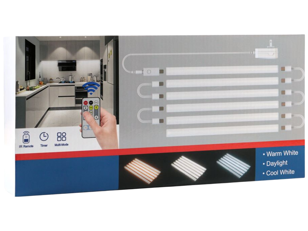 Модель FC-CGD-CCT - это универсальное решение для организации функционального и направленного освещения в кухонной зоне, гардеробе, витринах или над рабочим столом. Комплект состоит из шести линейных LED-модулей длиной по 30см, которые можно соединять в непрерывную цепь общей длиной до 1.8м. Конструкция выполнена из прочного ABS-пластика, отличается лёгкостью монтажа и надёжной фиксацией на любых горизонтальных или вертикальных поверхностях за счёт двухсторонней клейкой основы. Светодиоды типа 2835 SMD формируют ровный, рассеянный поток без мерцания и слепящих зон. Модель поддерживает три режима цветовой температуры (тёплый, нейтральный и холодный свет) с возможностью регулировки яркости на 4 уровня. Управление реализовано как с кнопки, так и с помощью инфракрасного пульта. Дополнительно предусмотрен таймер отключения. Подключение осуществляется через адаптер с питанием от сети.
