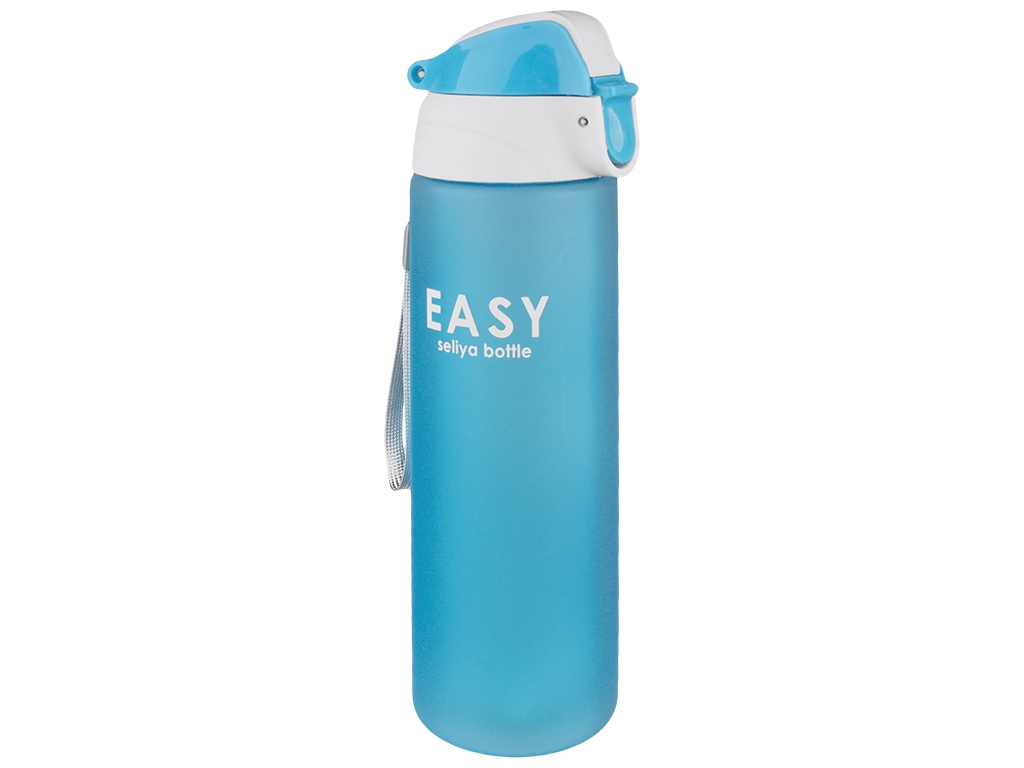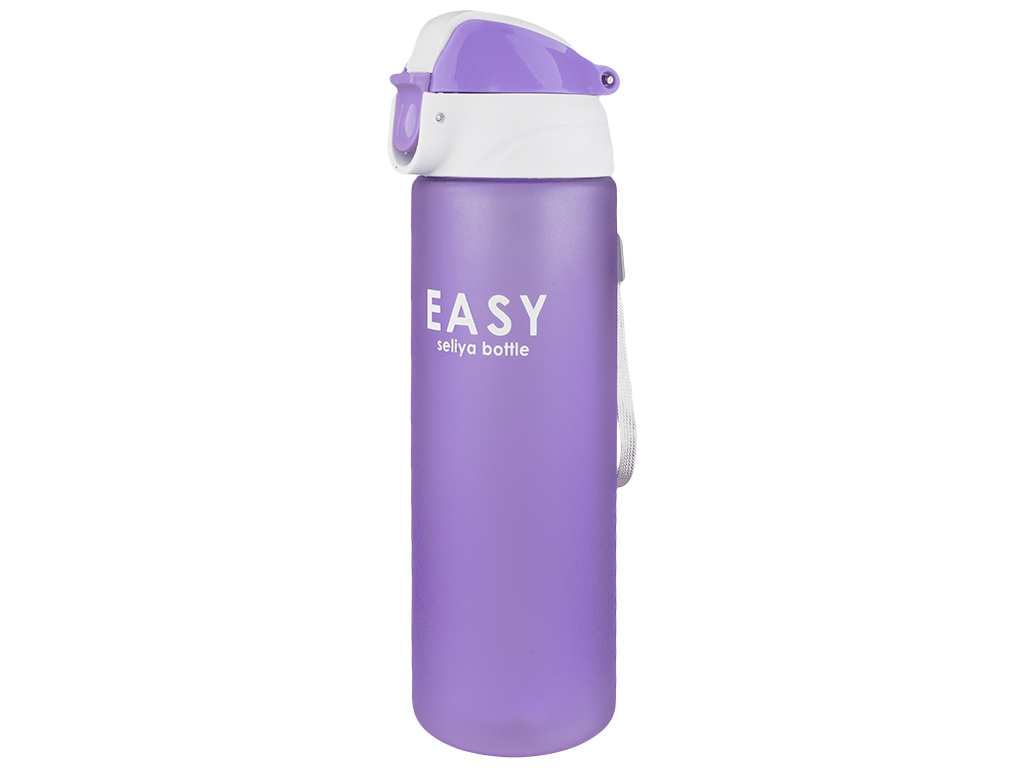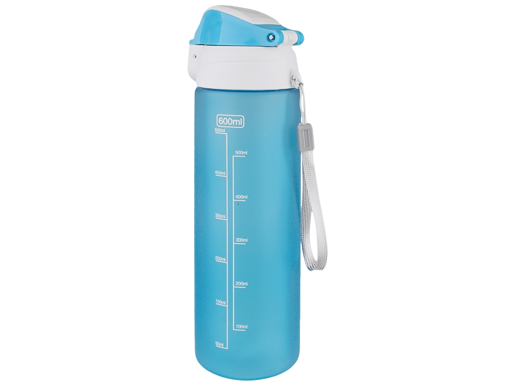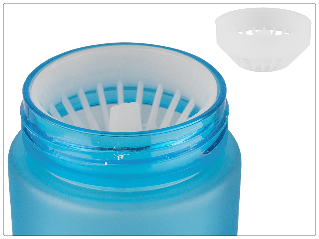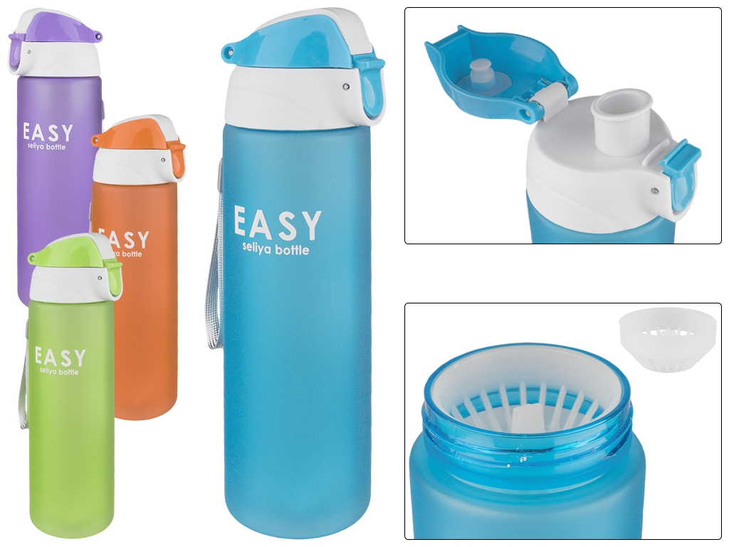 Размер: 8,3х6,9х24,2см. Объем: 600мл. Материал: пластик (крышка), полипропилен (емкость), силикон (уплотнители). Цвета ассорти. Полупрозрачная с покрытием soft touch, которое препятствует скольжению ладони. Винтовая крышка с откидной крышкой на кнопке-замке. К крышке крепится тканевая петля. Уплотнители внутри крышки обеспечивает плотное прилегание. На бутылку нанесена мерная шкала. Внутрь вставляется удобное сито для фильтрации кусочков фруктов. Без коробки.