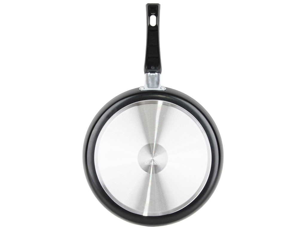 Тип сковороды: блинная. Форма: круглая. Диаметр: 24см. Высота: 2,2см. Длина ручки: 15,5см. Материал: алюминий. Материал ручки: пластмасса с покрытием "soft-touch". Антипригарное покрытие: двухслойное полимерное Xylan Plus. Цвет: черный. Тип плиты: электрическая, стеклокерамическая, газовая, галогеновая. Подходит для мытья в посудомоечной машине. Упаковка: картонная накладка, пэ-пакет.