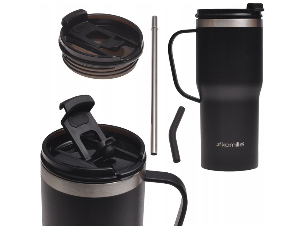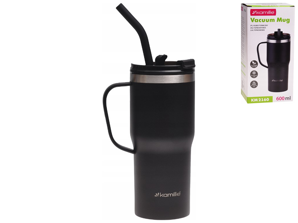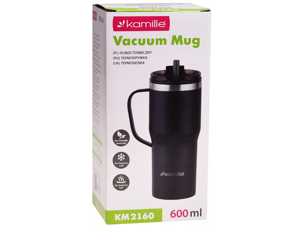 Термокружка Kamille благодаря своему стильному дизайну, эта термокружка станет незаменимым спутником на каждый день. Объем: 600мл. Высота: 20,5см. Упаковка: картонная коробка 12х8,7х20,5см. Цвет: черный. Материал колбы: нержавеющая сталь. Материал крышки: пластик. Время сохранения тепла: 8-10 час. Материал корпуса: нержавеющая сталь. Имеет съемную крышку с простой открывающей системой и стальную трубку с силиконовым мундштуком. Не рекомендуется мытье в посудомоечной машине.