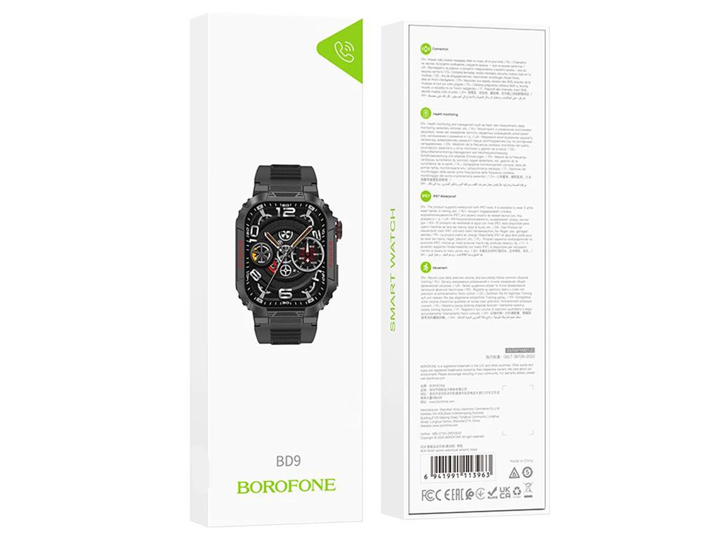Это многофункциональное устройство предназначено для контроля здоровья и взаимодействия со смартфоном через Bluetooth. Модель оснащена ярким IPS-дисплеем с разрешением 240x296 пикселей, сенсорным экраном и корпусом из цинкового сплава с закаленным стеклом, обеспечивающим защиту по стандарту IP67. Встроенный аккумулятор емкостью 300mAh обеспечивает работу до 7 дней, а поддержка 20 языков и совместимость с Android и iOS расширяют возможности использования. Borofone BD9 поддерживает функции мониторинга сна, сердечного ритма, уровня стресса, а также спортивные режимы и голосовое управление.