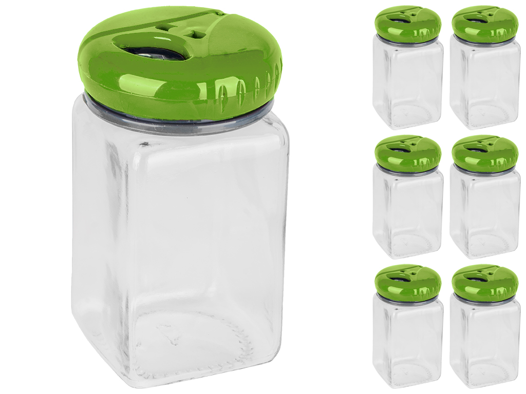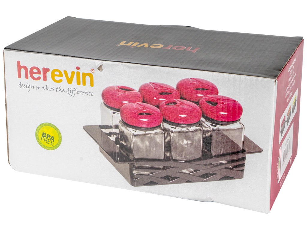 Спецовницы Herevin Bright colours. В наборе 6 предметов по 160мл. Размер спецовницы с крышкой: 5,5x5,5x9,5см. Размер подставки под спецовницы: 22x12x4см. Материал банки: стекло. Материал крышки и подставки: пластмасса. Цвета: салатовый, малиновый, оранжевый. Изделие предназначено для хранения различных специй. Функциональная и вместительная, такая банка станет незаменимым аксессуаром на любой кухне. Можно мыть в посудомоечной машине. Пластиковые части рекомендуется мыть вручную.