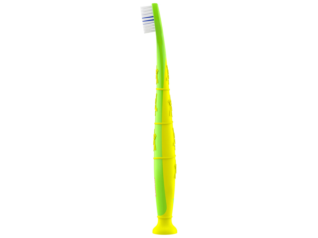 Щетина мягкая, синтетическая, с округлыми концами — форма подобрана для деликатного очищения эмали первых зубов. Ручка подходит по размеру для детской ладони и позволяет взрослому эффективно помогать ребёнку в процессе чистки.