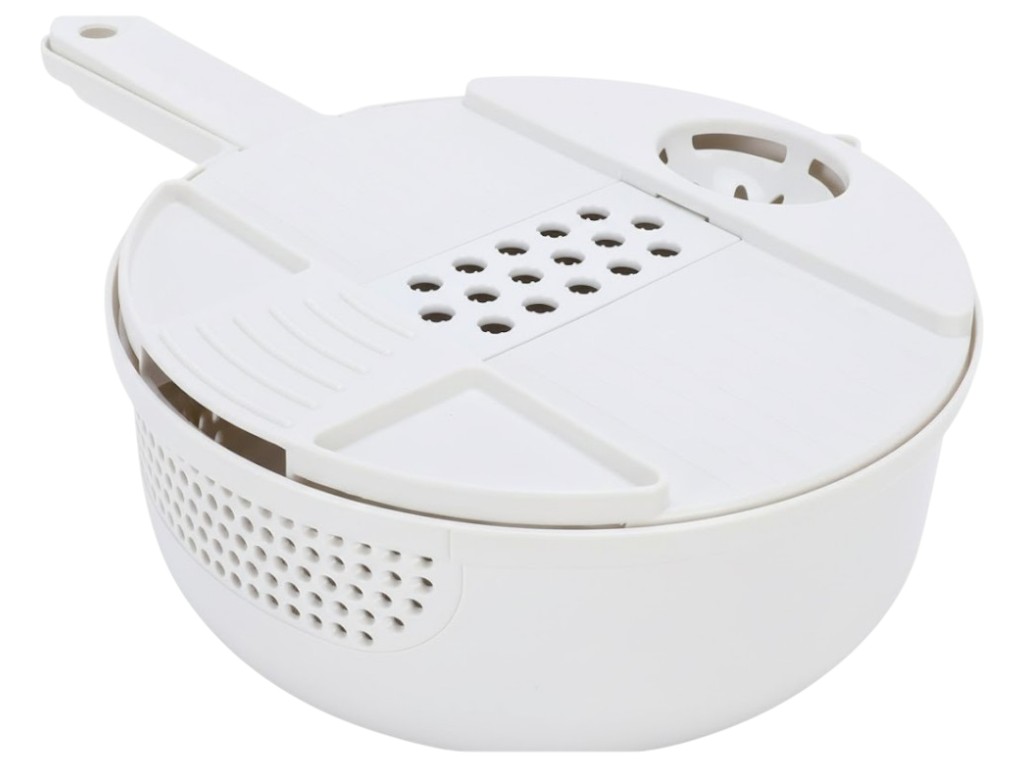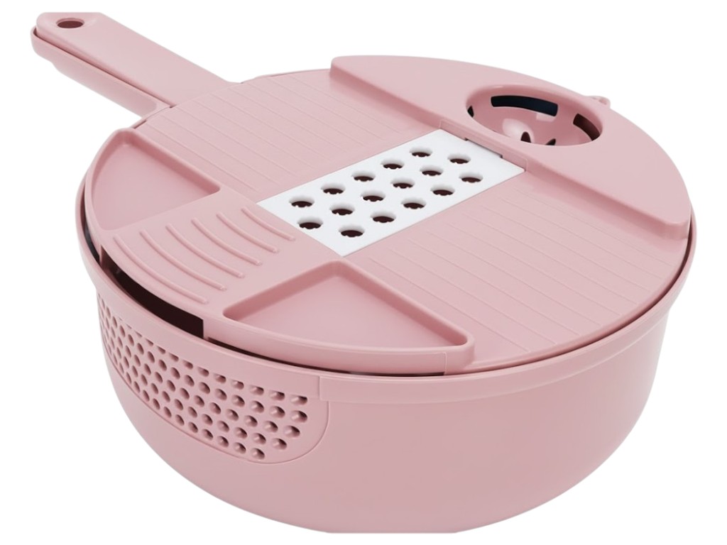 Терка-овощерезка создана для тех, кто ценит аккуратность и скорость на кухне. Она объединяет несколько функций — нарезку, шинковку, натирание и процеживание, превращая подготовку продуктов в удобный и чистый процесс. В комплект входят контейнер с ручкой, шесть сменных насадок, овощечистка и плододержатель. Каждая насадка имеет собственную задачу: тёрка для крупных ломтиков, насадка с мелкими отверстиями для измельчения, нож для нарезки соломкой, лезвие для тонких слайсов, решётка для кубиков и насадка с крупными отверстиями для моркови или сыра. Такое сочетание подходит как для овощей, так и для фруктов, сыра или шоколада. Контейнер из прочного пищевого пластика выдерживает частое использование и сохраняет форму. Встроенные дренажные отверстия позволяют удалять сок из овощей, сохраняя их текстуру. Лезвия из нержавеющей стали остаются острыми даже при ежедневном применении и не подвержены ржавчине. Ручка овощечистки удобно лежит в руке, а дополнительный держатель защищает пальцы во время работы. Овощерезка представлена в трёх цветах — синий, розовый и белый. Синий вариант придаёт кухне современный акцент, розовый добавляет нежность, а белый гармонирует с минималистичными интерьерами. Все элементы сочетаются между собой и легко складываются внутрь контейнера, экономя место на полке. Терка подходит для приготовления салатов, гарниров, супов, запеканок и детского питания. Её удобно использовать дома, на даче или в небольших кафе. После использования детали легко промываются под водой или в посудомоечной машине. Корпус не впитывает запахи, не окрашивается даже при нарезке свеклы и моркови. Компактная коробка с изображением всех элементов набора делает изделие удобным для хранения и транспортировки, а также подходит для подарка.