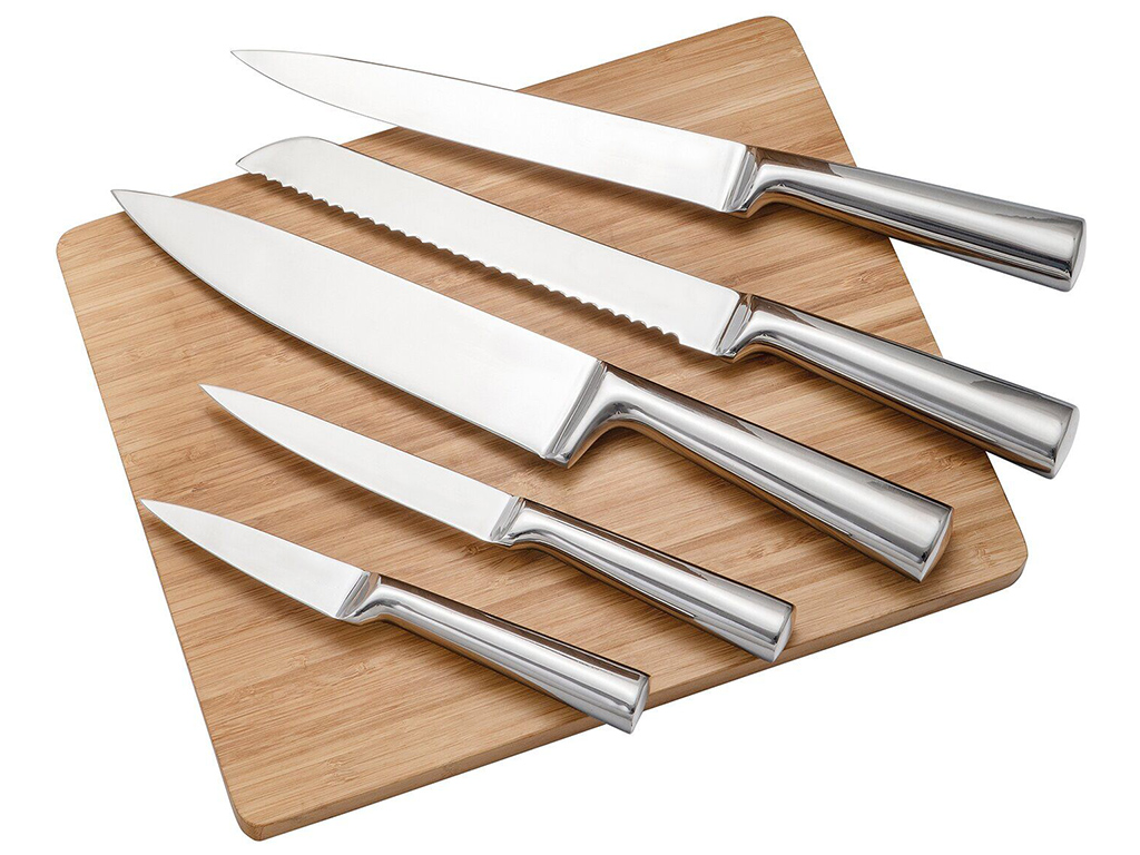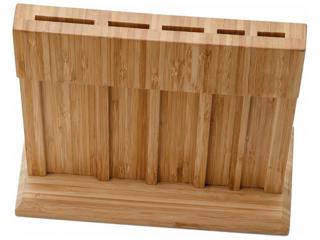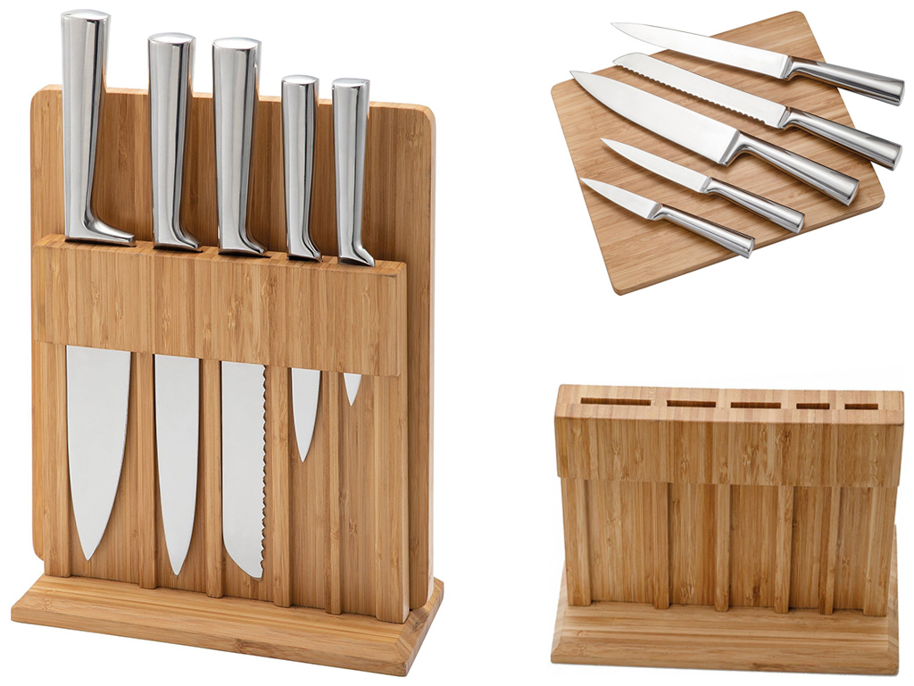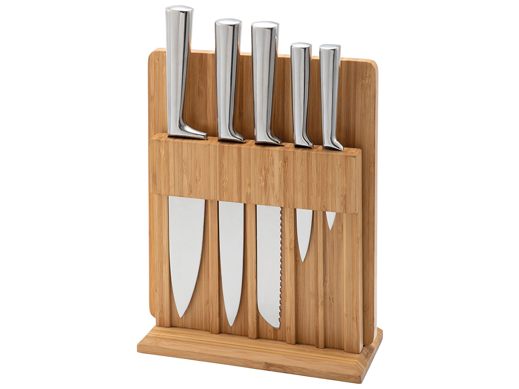 Тип: набор ножей. Материал лезвия: нержавеющая сталь. Материал ручки: нержавеющая сталь. Материал подставки: дерево. Количество предметов: 7шт. Состав набора: нож универсальный 13см; нож для хлеба 20см; нож для мяса 20см; нож поварской 20см; нож для овощей 9см; подставка; разделочная бамбуковая доска 36x24см. Подходит для мытья в посудомоечной машине. Тип подставки: настольная. Заточка лезвия: двусторонняя.