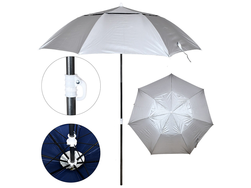Качественный пляжный (садовый) зонт с наклоном и ветровым клапаном. Диаметр: 1,45м. Количество спиц: 8шт. Глубина купола: 34см. Диаметр ткани: 170см. Максимальная высота: 1,85м. Минимальная высота: 1,3м. Материал: ткань, метал, пластик (фиксатор и колышки). Вес: 1.7 кг. Для более прочной фиксации зонта предусмотрены: тренога 17см и три колышка с веревкой и карабинами (длина одного колышка 18,5см). Также в комплекте идет чехол для зонта из прочной ткани, внутренняя часть чехла покрыта водоотталкивающим материалом. Размеры чехла: 72,5х10,5х7,5см. Качественная, плотная Ткань не парит. Не пропускает ультрафиолет. Усиленная конструкция спиц спейциально разработана для защиты от ветра. Ветровой клапан препятствует "выворачиванию" спиц при сильных порывах ветра. *Внимание! Внешний вид товара и его упаковки может отличаться от фотографий на сайте!