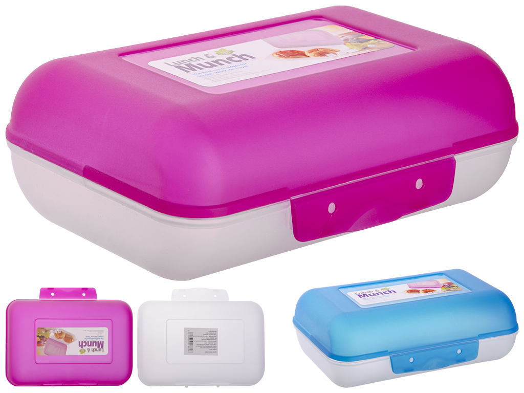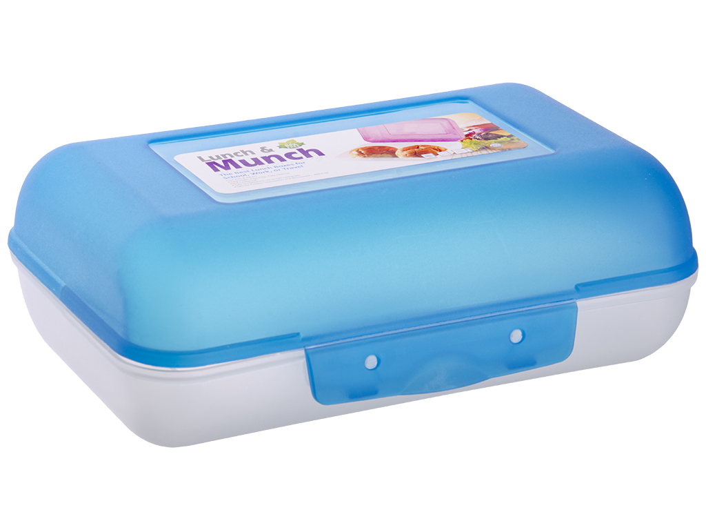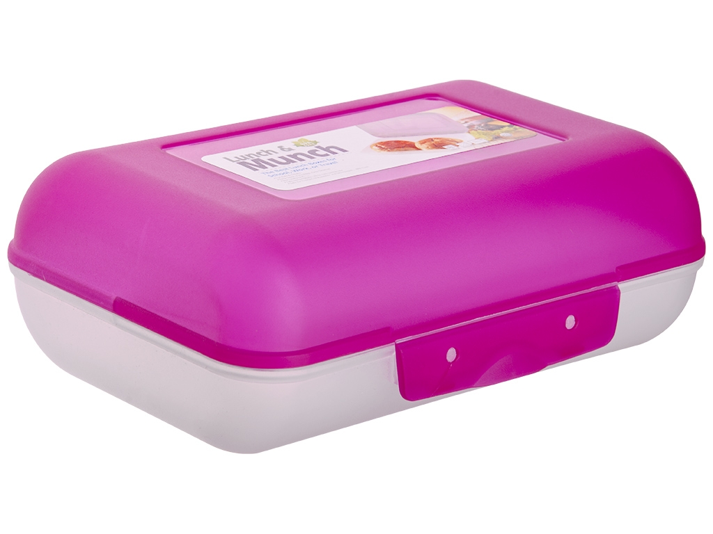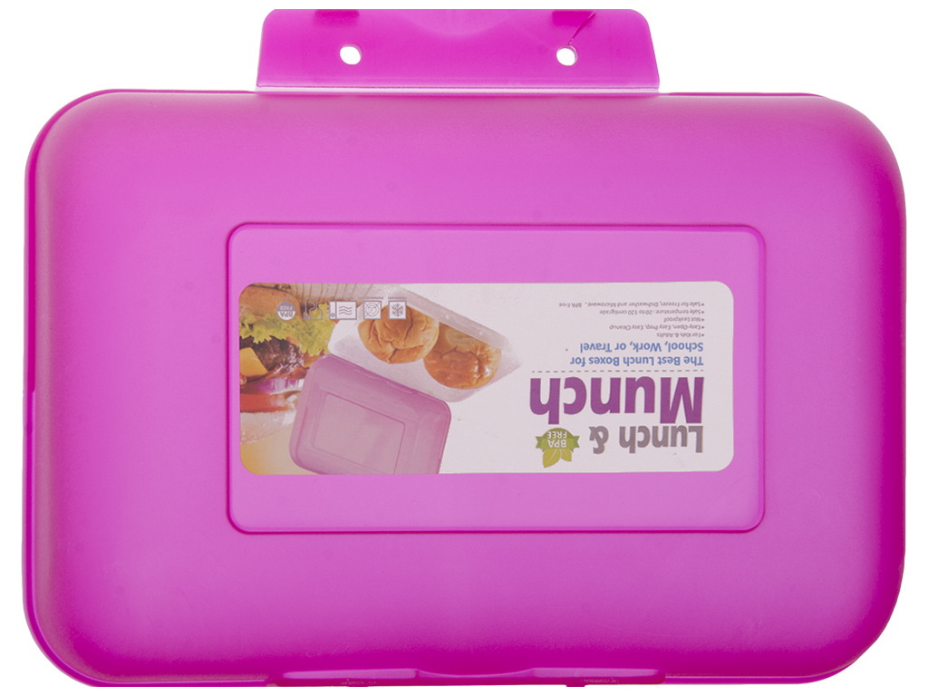 Размер: с замками-защелками 19,3х14х7,1см (на этикетке 19х13х7см). Материал: пластик. Форма: прямоугольная. Цвета: малиновый, темный голубой. Упаковка: пакет. Бутербродница изготовлена из полупрозрачного матового пластика, крышка цветная, в центре прямоугольное смотровое окошко (пластик в этом месте прозрачный глянцевый). Ланч-бокс имеет по бокам замки-защелки. Данная емкость для сэндвичей идет без уплотнителя. Не предназначено для транспортировки жидких блюд.