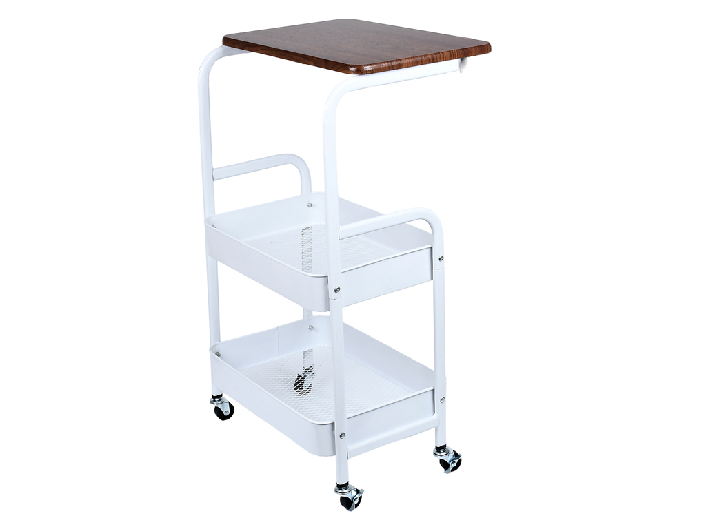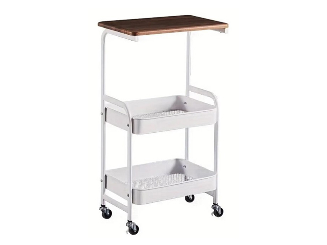 Этажерка на колесах с тремя ярусами — универсальное решение для организации пространства дома или офиса. Каркас выполнен из белого окрашенного металла, что придает конструкции легкость и аккуратность. Верхняя полка из МДФ с натуральной текстурой дерева становится стильным акцентом. Две металлические полки с сетчатым дном и бортиками обеспечивают удобное хранение вещей и предотвращают их выпадение. Благодаря колесикам с фиксаторами этажерку легко перемещать и надежно фиксировать на месте. Компактные размеры позволяют разместить этажерку даже в небольших помещениях: на кухне, в ванной комнате, рабочем кабинете или мастерской.