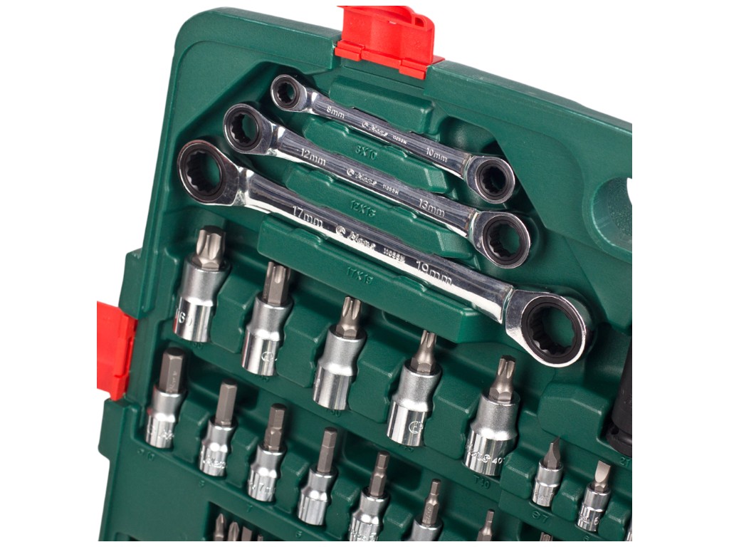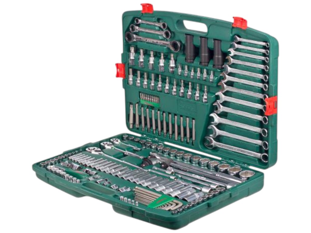 Всё содержимое удобно разложено в прочном пластиковом кейсе размером 560×395×95 мм. Корпус оснащён металлическими петлями и фиксирующими замками, что исключает случайное открытие. Каждый инструмент имеет своё место, а маркировка внутри кейса помогает быстро находить нужный элемент. Такой набор станет надёжным помощником в профессиональной мастерской, гараже или на выездных работах. Он рассчитан на долгий срок службы и сохранение функциональности даже при интенсивной эксплуатации.