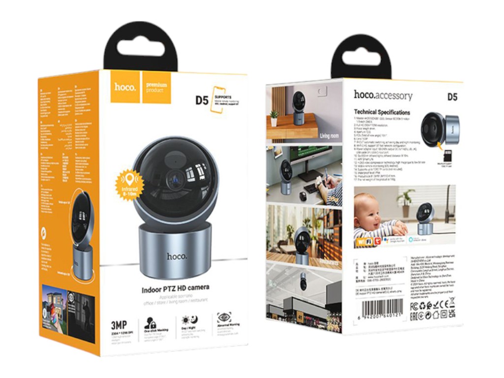 Эта камера не требует внимания - она сама за всем проследит. Смарт-камера Hoco D5 органично впишется в интерьер и включится в работу за пару минут. А потом - только пуши на смартфон и уверенность, что дома всё под контролем.
