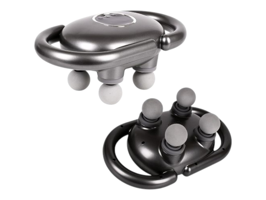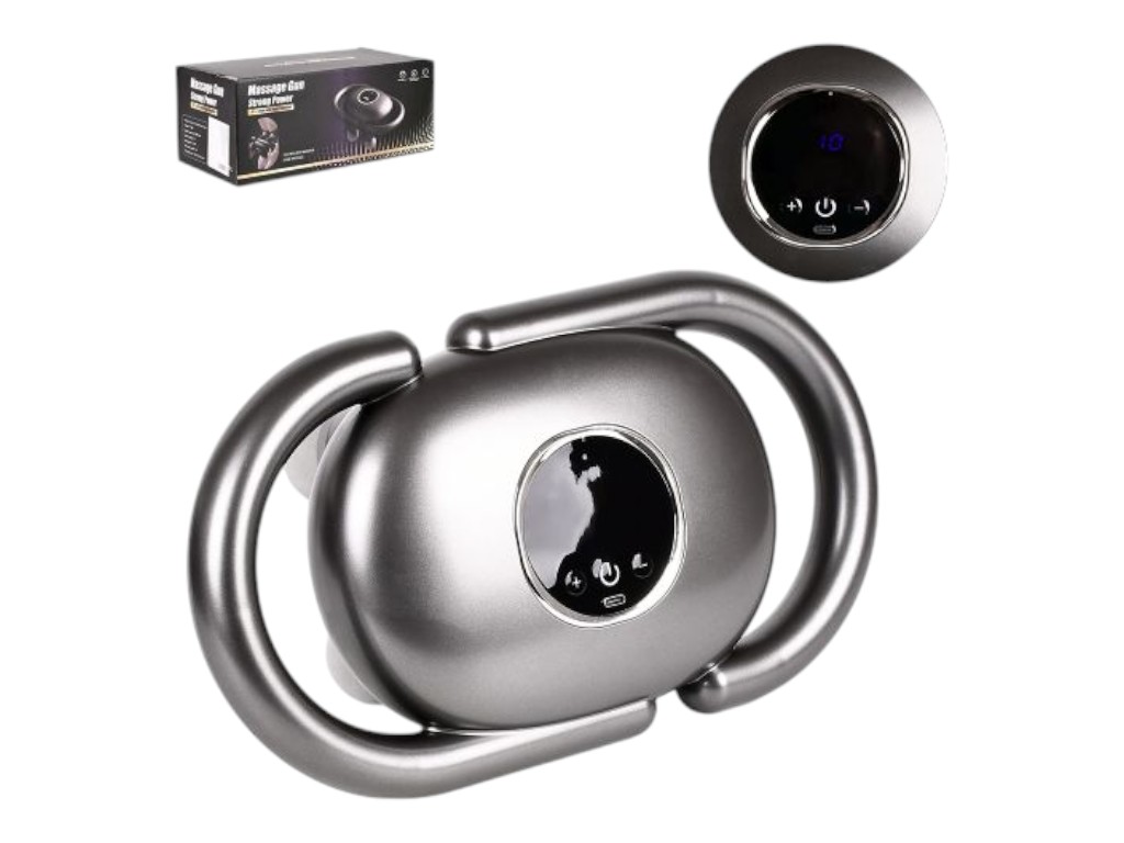 Разработан для точечного массажа и расслабления мышц после нагрузки. Устройство оснащено сенсорной панелью и цифровым дисплеем для выбора интенсивности, работает от USB. Две боковые рукоятки обеспечивают устойчивый захват и контроль над движением. Корпус выполнен из пластика и металла, подходит для домашнего или офисного использования.