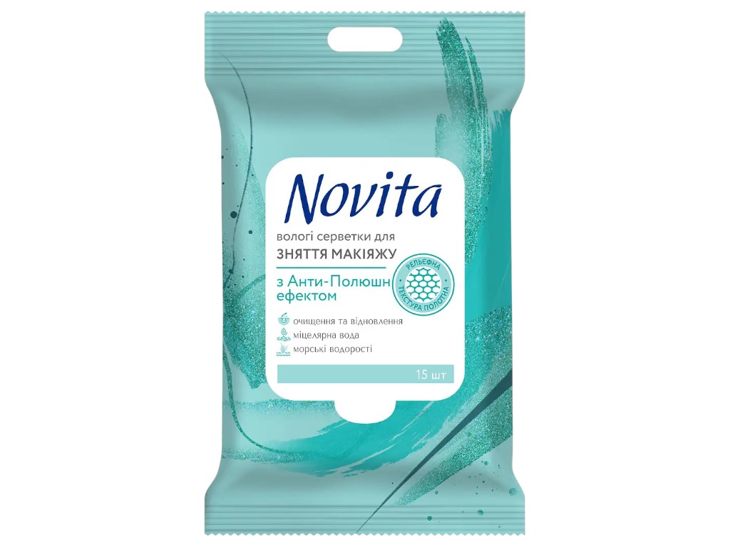 Салфетки влажные для снятия макияжа Novita Make up&Care, анти-полюшн эффект, морские водоросли, 15шт