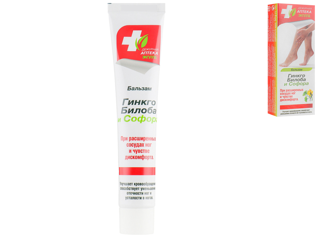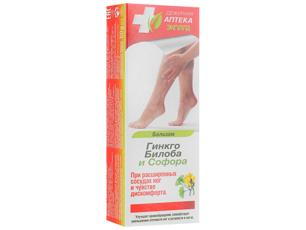 Бальзам Гинкго билоба и софора Дежурная Аптека Эколла 50г. Для проблемных участков кожи ног, при отечностях и застоях, усталости и тяжести в ногах. Улучшает венозный и капиллярный кровоток, тонизирует сосуды, снимает венозные застои, производит охлаждающий эффект. Экстракт известного целебного растения Гинкго Билоба помогает стимулировать кровообращение, защищает стенки сосудов, снижает риск образования тромбов и уменьшает вязкость крови. Экстракт Софоры, богатый витаминами Р, С и рутинами помогает укреплению капилляров, восстанавливает их эластичность. Экстракт конского каштана, насыщенный эсцином, снижает отечность, снимает воспалительные процессы, улучшает движение крови и укрепляют сосуды.