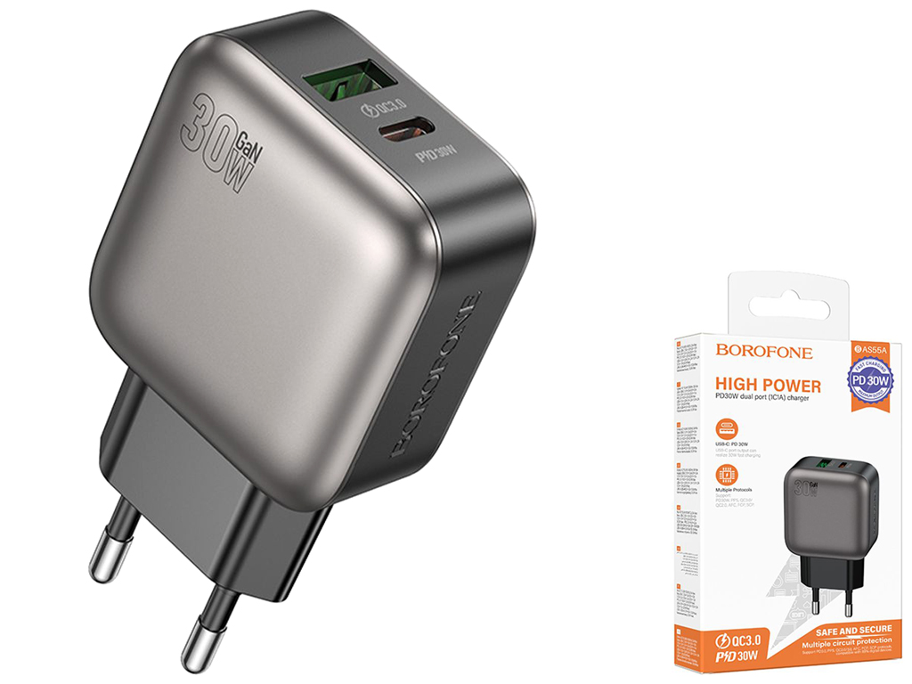 Сетевое зарядное устройство Borofone BAS55A 1USB-C/1USB PD/QC 30W GAN, цвет черный