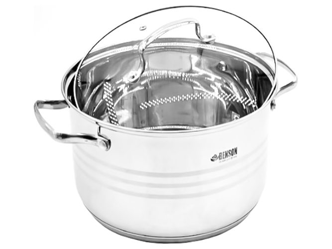 Набор кастрюль Benson из высококачественной нержавеющей стали. Крышка из термостойкого стекла и оснащена отверстием для выхода пара. Посуда имеет 5-слойное дно с хорошей теплопроводностью. Есть мерная шкала. Ручки не нагреваются. Подходит для всех кухонных плит. Можно мыть в посудомоечной машине. Количество предметов в наборе: 8шт. В набор входит: кастрюля с крышкой 2,1л; кастрюля с крышкой 2,9л; кастрюля с крышкой 3,9л; кастрюля с крышкой 6,5л.