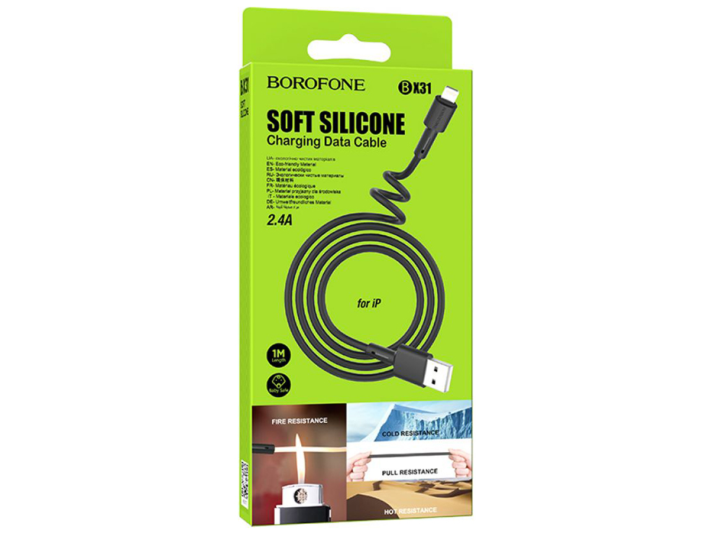 Кабель USB Borofone BX31 Silicone Lightning - современный, надежный кабель от производителя Borofone. Позволяет подключить ваше устройство, как для синхронизации с компьютером, так и для зарядки. Упаковка выполнена в современном стиле, отличный вариант для витрины. Модель представлена в нескольких цветовых решениях. Корпус штекеров изготовлен из прочного материала. Надежность аксессуара обеспечивает, приятная на ощупь, силиконовая оплетка, которая, помимо превосходных тактильных ощущений, устойчива к растягиванию, гарантирует сохранение работоспособности кабеля в условиях низких и высоких температур и, даже, при нагреве на открытом огне. Установление соединения между устройствами осуществляется через usb – Lightning. Характеристики кабеля не допускают падения выходного тока и напряжения. Максимальная сила проводимого тока равна 5 А. Длина кабеля - 1 м.