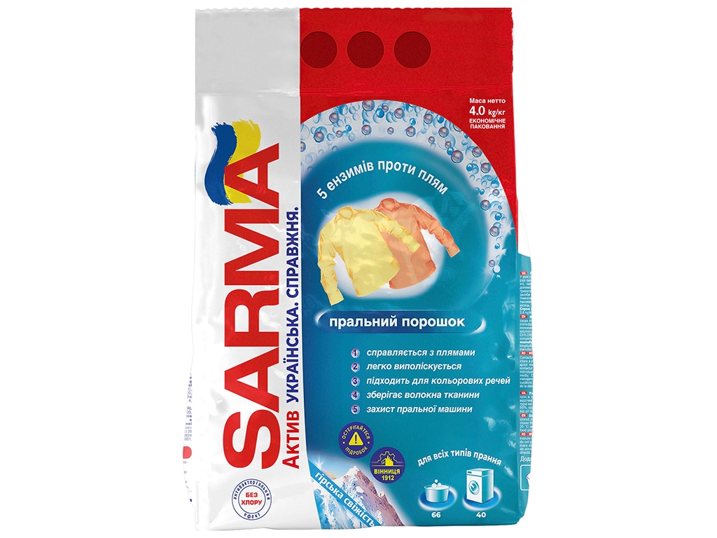 Пральний порошок Sarma Актив «Гірська свіжість» зі зниженим піноутворенням, призначений для прання виробів із бавовняних, лляних, синтетичних тканин, а також тканин зі змішаних волокон (окрім виробів із натурального шовку й вовни) в автоматичних пральних машинах, машинах активаторного типу й ручного прання.