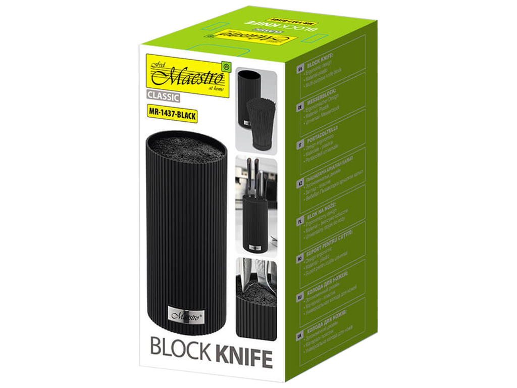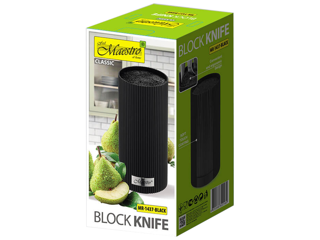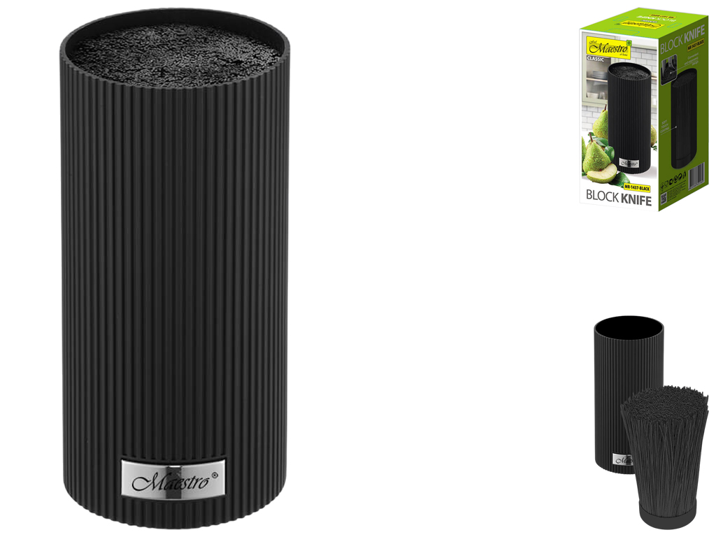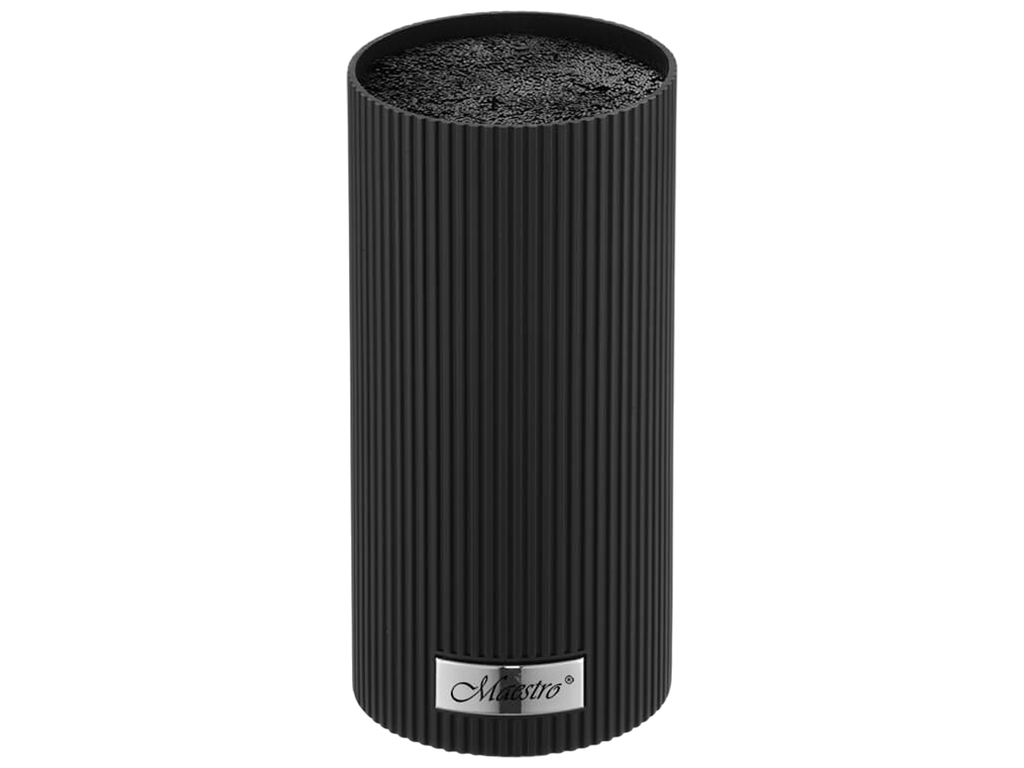 Підставка для ножів Maestro ідеально підходить для зберігання як металевих, так і керамічних ножів різних форм та розмірів. Вона запобігає затупленню ножів, появі подряпин, іржі та розбиттю завдяки знімному внутрішньому наповненню з гнучких пластикових прутів. Эргономічний дизайн. Висота: 22см. Матеріал: пластик, покриття Soft-touch.