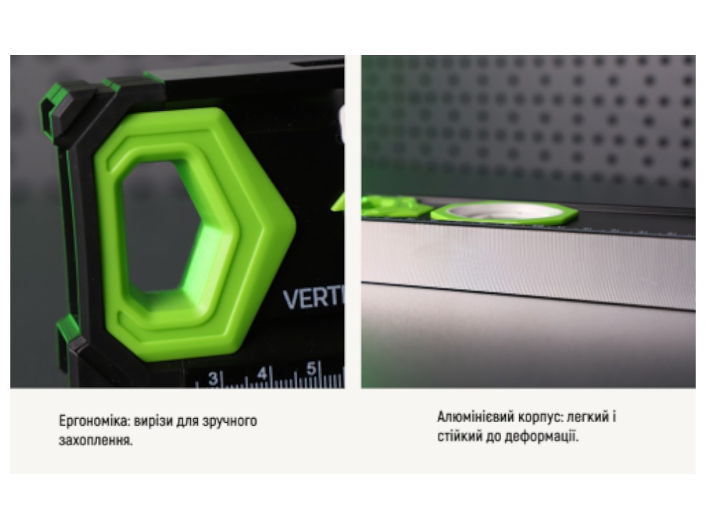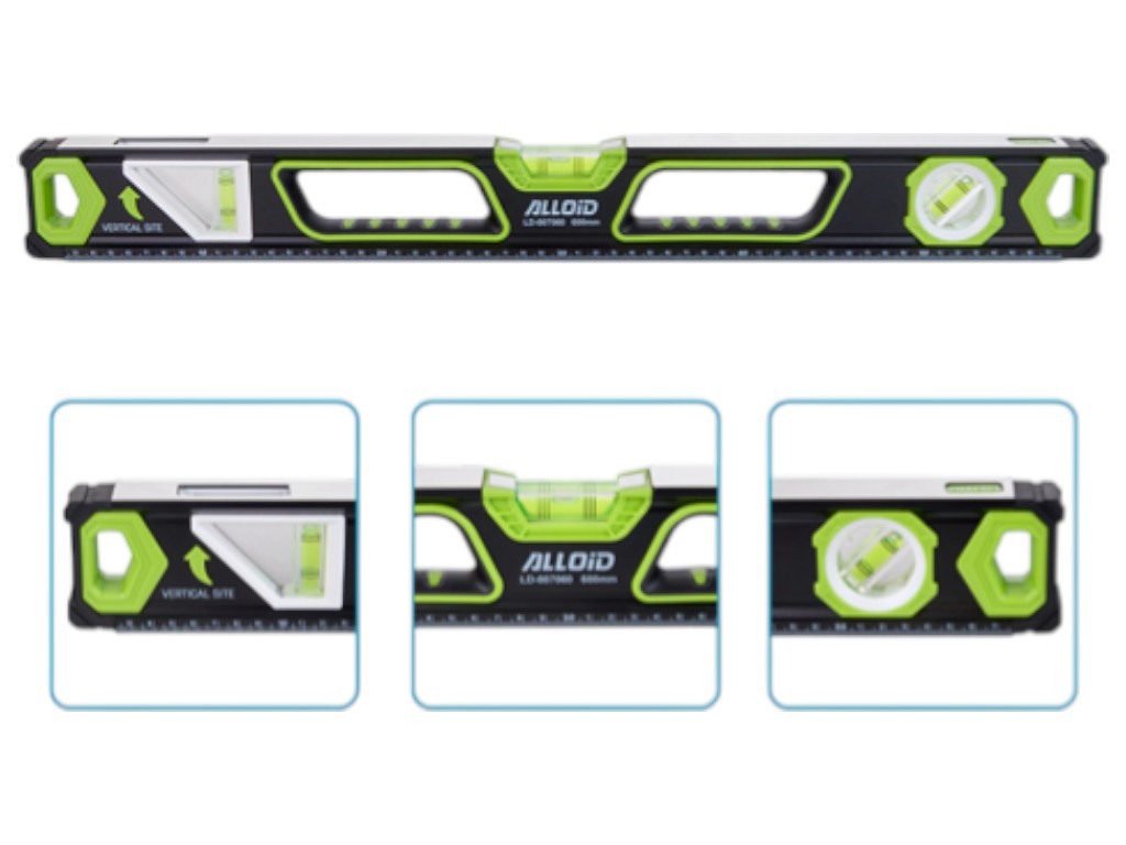 Три вимірювальні капсули з кутами 0°, 45° і 90°, бічне вікно для вертикального зчитування і ергономічні вирізи з боків забезпечують зручність при розмітці і монтажі в обмеженому просторі. Анодований алюмінієвий корпус стійкий міліметрова шкала, що полегшує проведення допоміжних вимірів.