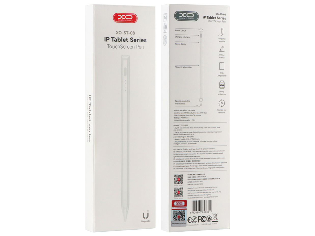 Стилус XO ST-08 - це універсальний інструмент для роботи та творчості. Він стане чудовим доповненням до iPad - ідеально підходить для малювання, створення нотаток, роботи в офісних додатках, ігор та багато чого іншого. Оптимальні розміри (8,9х166мм) і невелика вага (всього 13,1г). Корпус з легкого, але надзвичайно міцного алюмінієвого сплаву. Змінний наконечник зі зносостійкого полімеру з кінчиком завтовшки всього 1,5 мм. Вбудований магніт практично вздовж усього корпусу (14мм) для надійної фіксації на металевій грані планшета. Ємний вбудований акумулятор - 8 годин роботи у звичайному режимі. LED індикатори з приємним для очей синім світлом для визначення рівня заряду. Сучасний роз'єм Type-C для швидкої зарядки - від 0 до 100% всього за 40 хвилин. Швидке розпізнавання всіх дій без будь-якої затримки. Визначення місця розташування дотику з точністю до 0.5 мм і кута нахилу в 6 положеннях (6D). Високотехнологічний датчик з удосконаленим алгоритмом для захисту від випадкових торкань по всьому екрану.